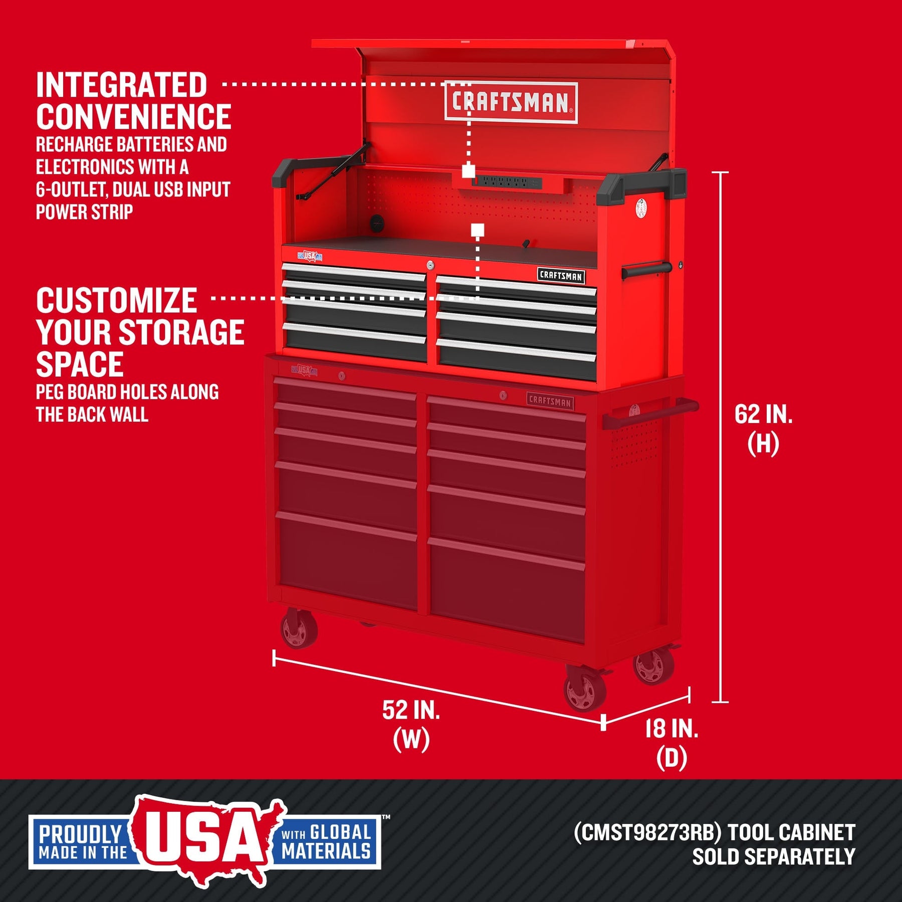 - Integrated Power Strip: Includes a 6-outlet, dual USB input power strip for charging tools and devices.