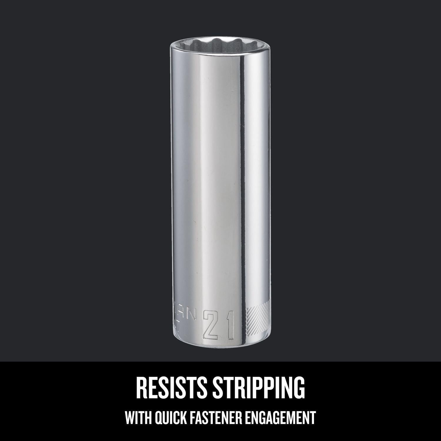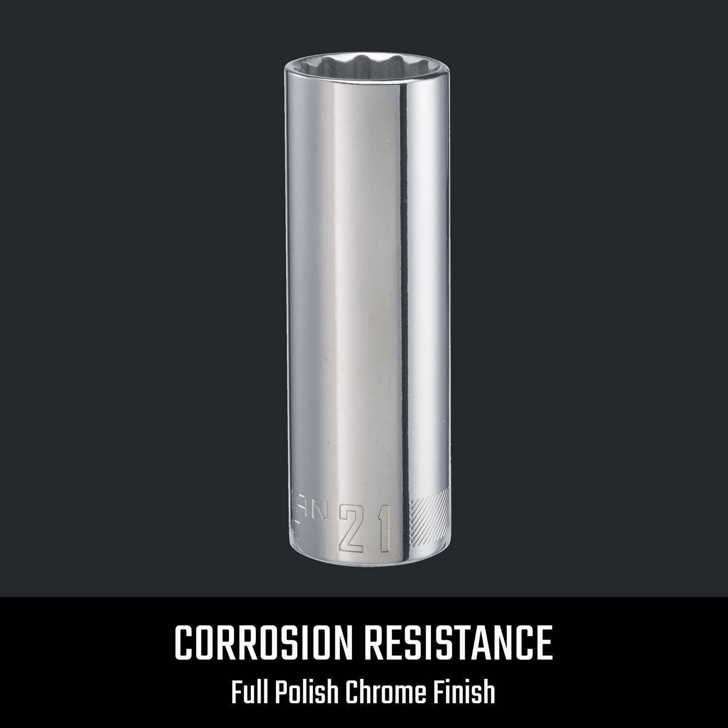 The Craftsman 21 mm Metric Deep Socket is a durable and precise tool designed for automotive and home repair tasks. Its polished chrome finish ensures corrosion resistance, while the 12-point design provides secure fastener engagement.