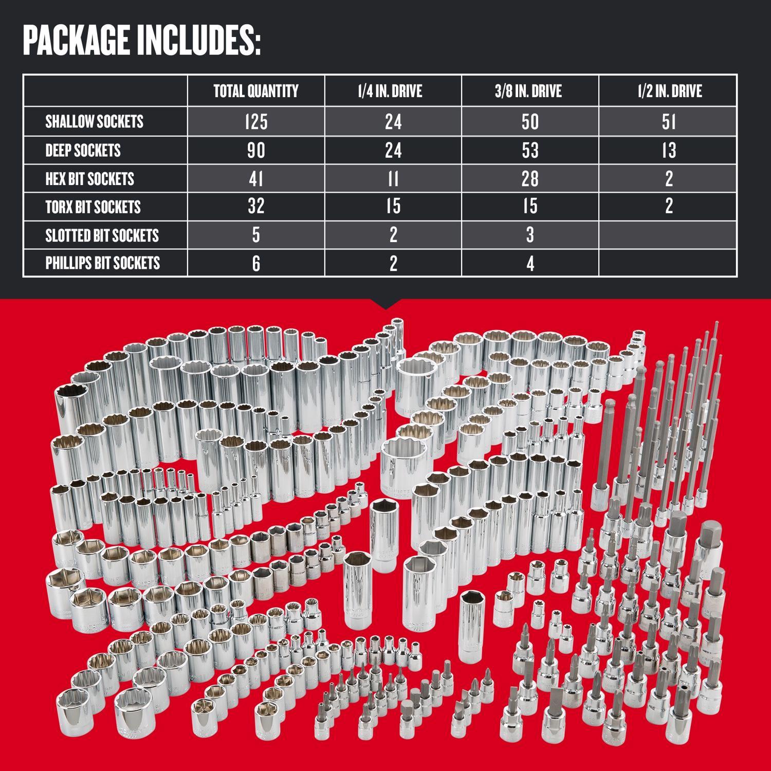 | What's Included | (90) Deep Hand Sockets, (125) Shallow Hand Sockets, (41) Hex Bit Sockets, (32) Torx Bit Sockets, (5) Slotted Bit Sockets, (6) Phillips Bit Sockets |