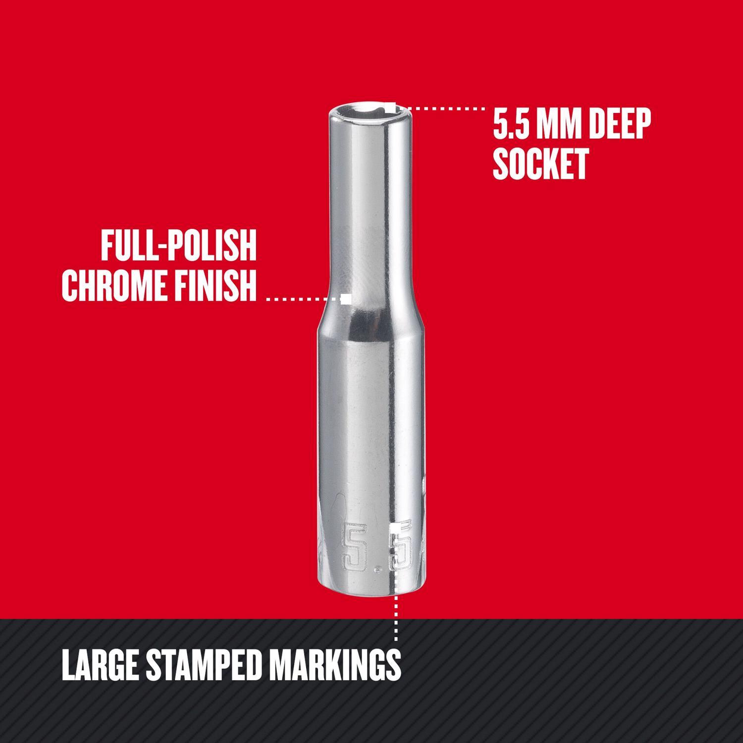 The Craftsman 5.5 mm Metric Deep Socket is a durable and precise tool designed for hard-to-reach fasteners. Its polished chrome finish ensures corrosion resistance, while the 6-point design provides increased torque and secure fastener engagement.