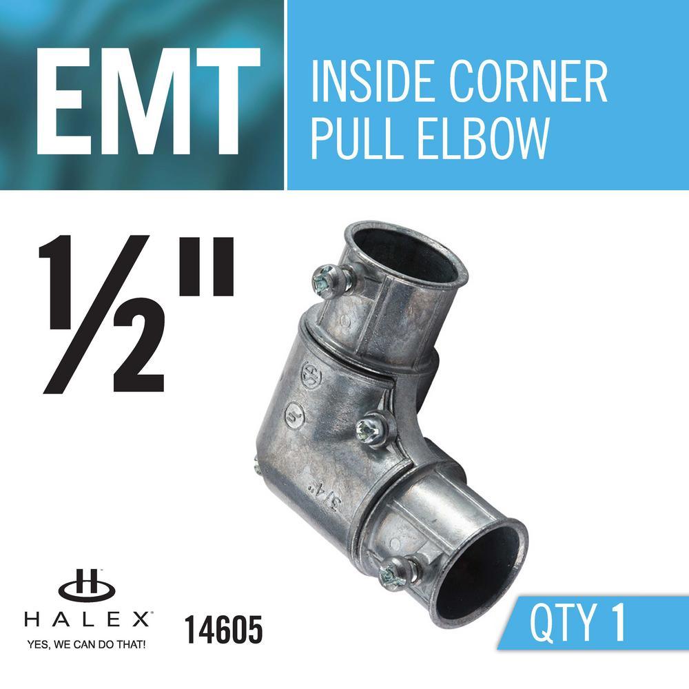 The 1/2 in. Inside Corner EMT Pull Elbow joins sections of EMT conduit at an inside corner. A removable cover enables wire pulling. This elbow is corrosion resistant.