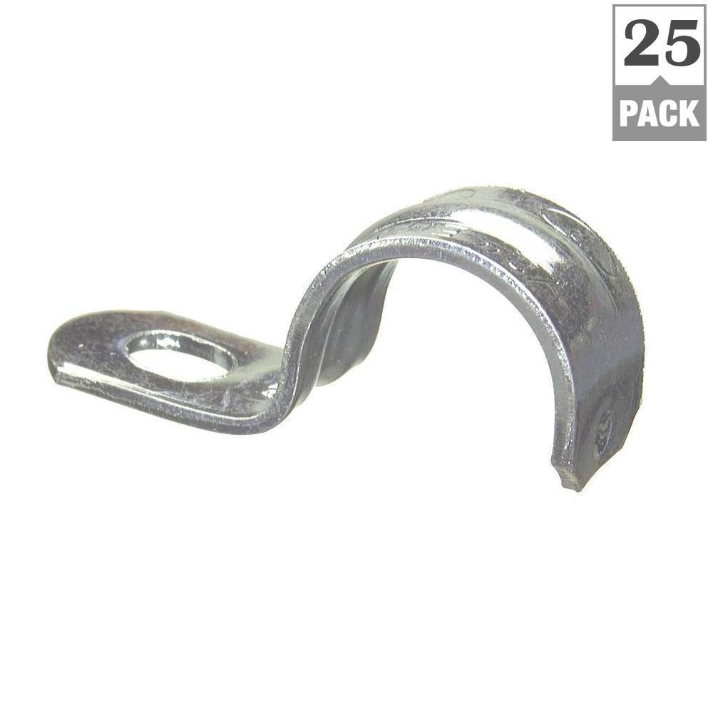 The 1/2 in. EMT 1-Hole Straps (25-Pack) secure EMT conduit to wood, masonry or other surfaces that require increased load bearing. The straps are made of zinc-plated steel and designed for indoor or outdoor use. Strap positively snaps on the conduit when installed.