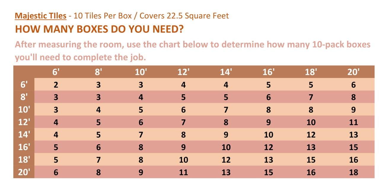 Do you want to give your room a brand new, modern look and at a low cost? Look no further than our assortment of Achim Majestic Tiles! The dramatic 18 x 18 self-stick vinyl tile, featuring classic marble and stone designs, delivers the appealing look of real stone in a premium performing light commercial grade vinyl tile. Achim tiles can be used in any room in your home including the Kitchen, Dining Room, Bedrooms, Bathrooms, Foyers and Basements. No messy glue or adhesives needed. Just peel and stick the Majestic tiles to a flat and dry surface and show off your beautiful new room to all your friends and neighbors. No wax finish. 10 Tiles per box, 22.5 Square Feet per Box.