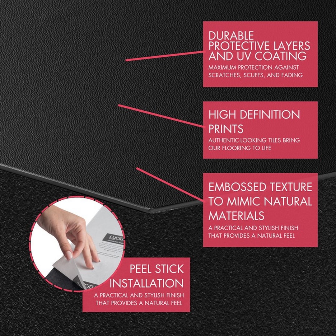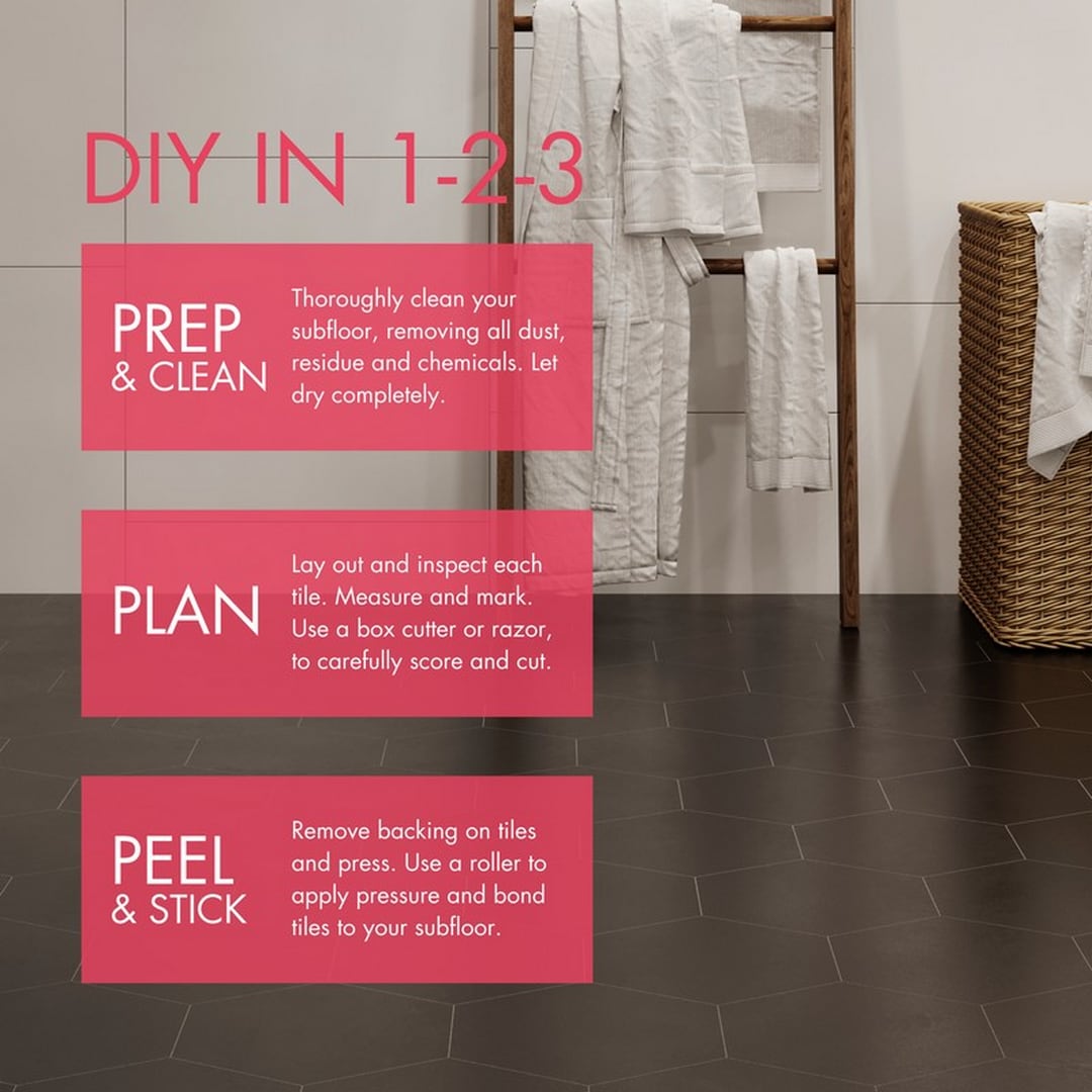 Transform any space effortlessly with Lucida's BaseCore HEX Black Peel and Stick Vinyl Tile, designed for simple, mess-free installation. With a sleek black finish and slip-resistant texture, these luxurious vinyl tiles deliver both style and durability, perfect for high-moisture areas like kitchens and bathrooms.
