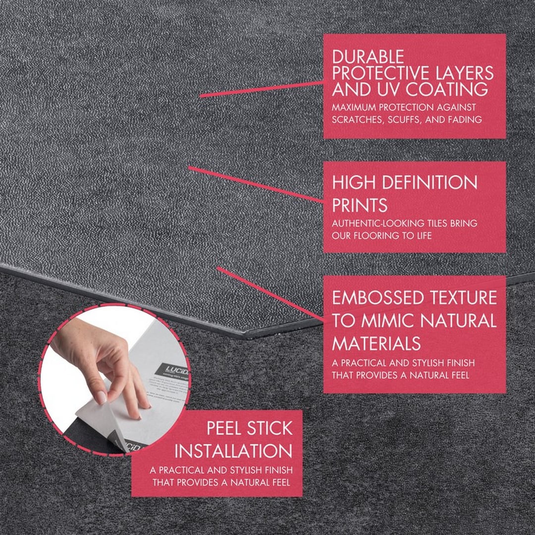 Transform your surfaces with Lucida USA's high-quality waterproof peel and stick vinyl tiles. Easy to install and made with a durable 12-mil wear layer, these tiles are perfect for high-moisture areas like kitchens and bathrooms. Their solid dark gray finish adds a modern touch to any room while providing long-lasting performance.