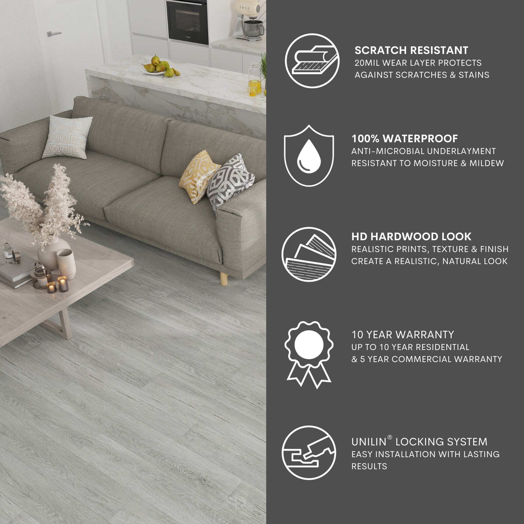 Lucida USA's MaxCore Pro Greywolf Gray Vinyl Plank Flooring combines stylish aesthetics with robust functionality, offering the ultimate flooring solution for homes and businesses. Featuring a 100% waterproof, 20-mil wear layer, and a powerful drop lock system, this flooring ensures durability and an easy installation process.