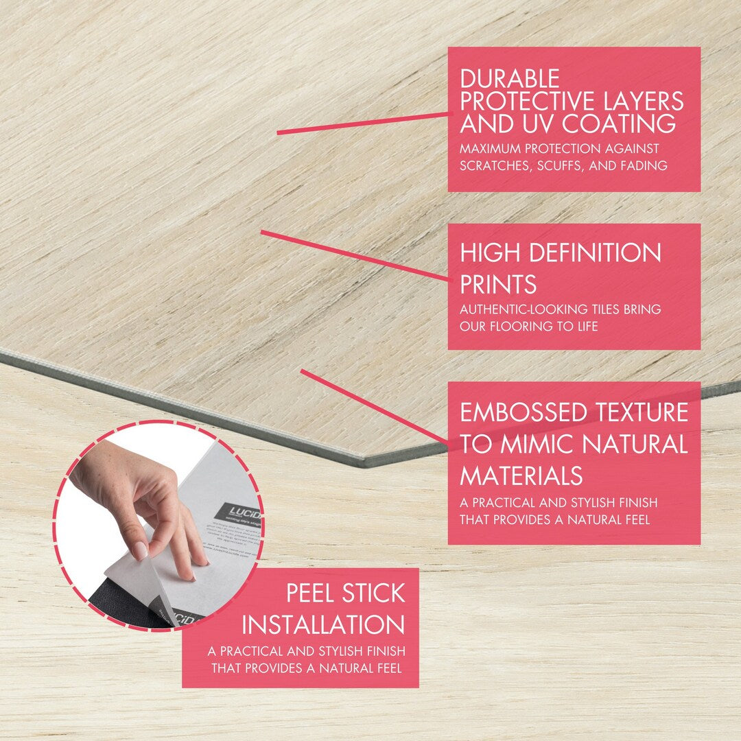 Elevate your space with Lucida's Pistachio Brown Peel and Stick Vinyl Tile, designed for ease and style. Featuring a waterproof, wood-look design and DIY-friendly installation, this luxe vinyl tile is perfect for high-moisture areas.