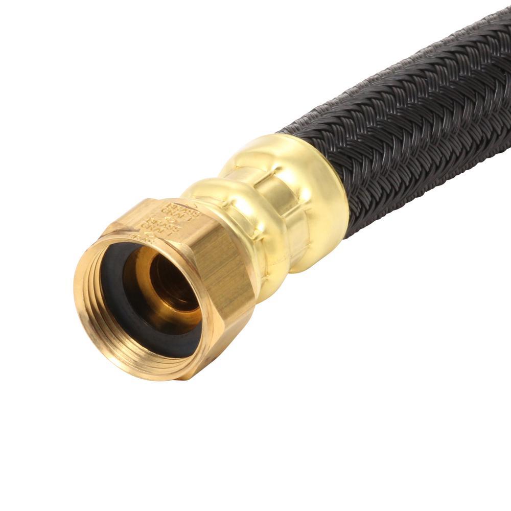 BrassCraft 3/4 in. MIP x 3/4 in. FIP x 12 in. Polymer Braided Water Heater Connector (0.57 in. I.D.), also known as Speedi Plumb PLUS connectors, combine advanced corrosion technologies with state-of-the-art manufacturing to provide the most flexible, corrosion resistant water heater connector available on the market today. Speedi Plumb PLUS patented polymer-braided jacket is specially engineered to be less abrasive and more flexible than the leading connectors. The polymer fibers bend freely without kinking, crimping or flattening, making installation easier, especially in cramped quarters. The braided jacket is also designed to resist corrosion from harsh household chemicals that can corrode and deteriorate stainless steel braiding. Polymer fibers are resistant to high temperature making them ideal for water heater connections. With a non-conductive polymer braid and EPDM rubber core, the absence of dissimilar metals within the waterway eliminates the potential for galvanic corrosion and the need for a dielectric union with the installation.