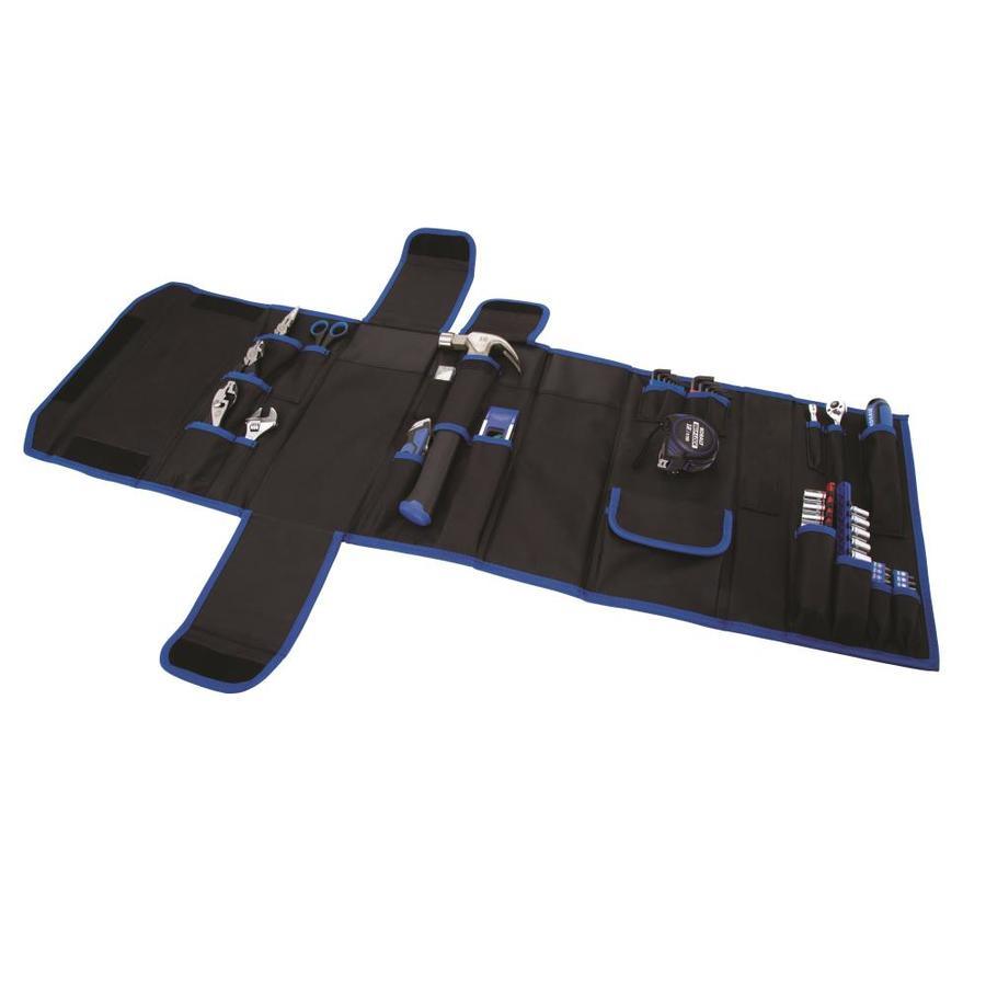 The dual-layered nylon case unfolds to display all of the tools while working and returns neatly to a briefcase carrier simply by folding and fastening the strong Velcro and plastic clips; the double-stitched handle provides security when carrying