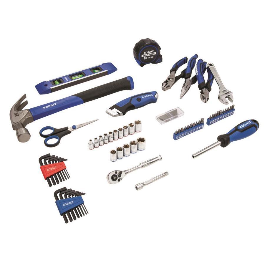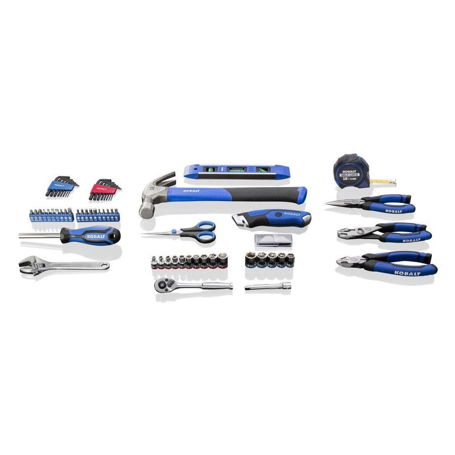 Other tools include 16 metric and SAE hex keys, 16 oz hammer, driver handle with 20 insert bits, 3-piece pliers set, 6-in adjustable wrench, 12-ft measuring tape, 9-in level, a pair of household scissors and retractable utility knife with 10 spare blades