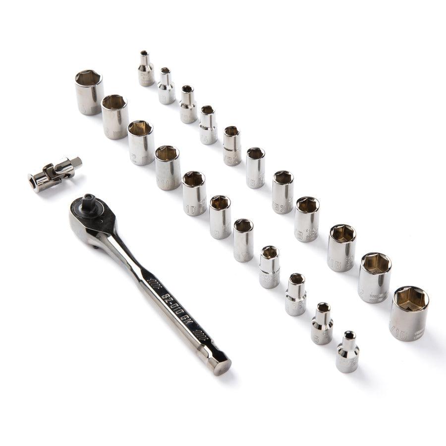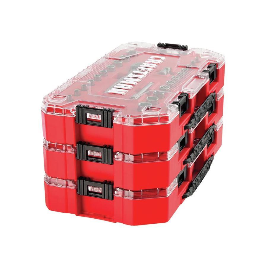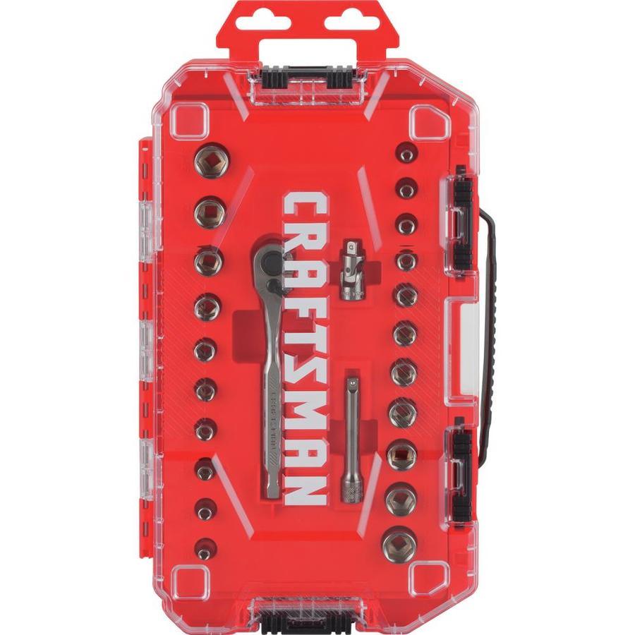 Compatible with the VERSASTACK™ Portable Storage System CORROSION RESISTANCE: Gun Metal Chrome Finish INCREASED ACCESS AND MINIMAL ARC SWING: 120-tooth Ratchet INCREASED TORQUE: 6 Point Socket with fastener MOBILITY and DURABILITY: Compact Storage Case QUICK SIZE IDENTIFICATION: Large Markings Meets or Exceeds ASME Specifications Common applications include automotive mechanical and home repair Includes (10) 1/4-in Dr Shallow 6 PT Sockets SAE (5/32,3/16,7/32,1/4-in,9/32,5/16,3/8,7/16,1/2,9/16-in), (11) 1/4-in Dr Shallow 6 PT Sockets MM (4,5,6,7,8,9,10,11,12,13,14mm), (1) 120T 1/4-in Ratchet, (1) 1/4-in Dr Ext Bar (3-in), (1) 1/4-in Dr Univ Join