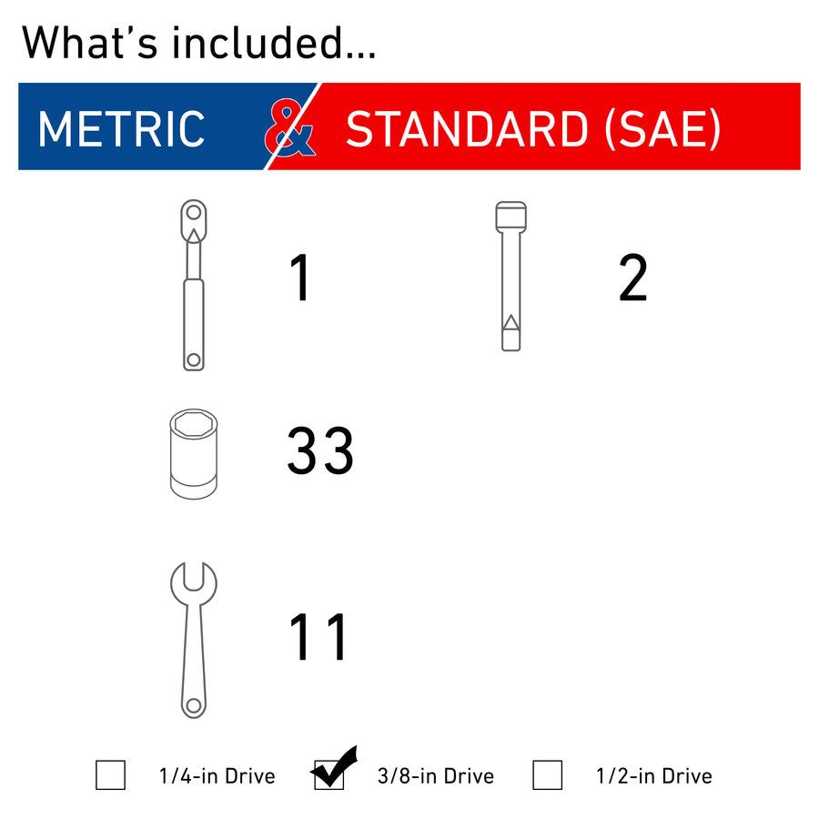 Also includes (5) 3/8-in Drive 6 PT Deep Sockets Metric (9,10,12,13,14mm), (5) SAE Combination Wrenches (3/8,7/16,1/2,9/16,5/8-in), (6) Metric Combination Wrenches (8,10,12,13,14,15mm), (2) 3/8-in Drive Ext Bars (3,6-in), (1) 3/8-in Drive Ratchet