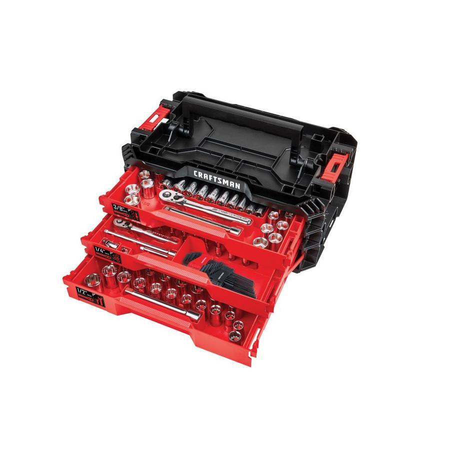 Includes (111) Shallow and Deep 6 PT Sockets, (3) Drive Ratchets (1/4, 3/8, 1/2-in), (2) 3/8-in Drive Spark Plug Sockets, (14) Combination Wrenches, (8) Ratchet Accessories, (33) Specialty Bits, (28) Hex Keys, (16) Nut Bits and (1) Magnetic Nut Driver