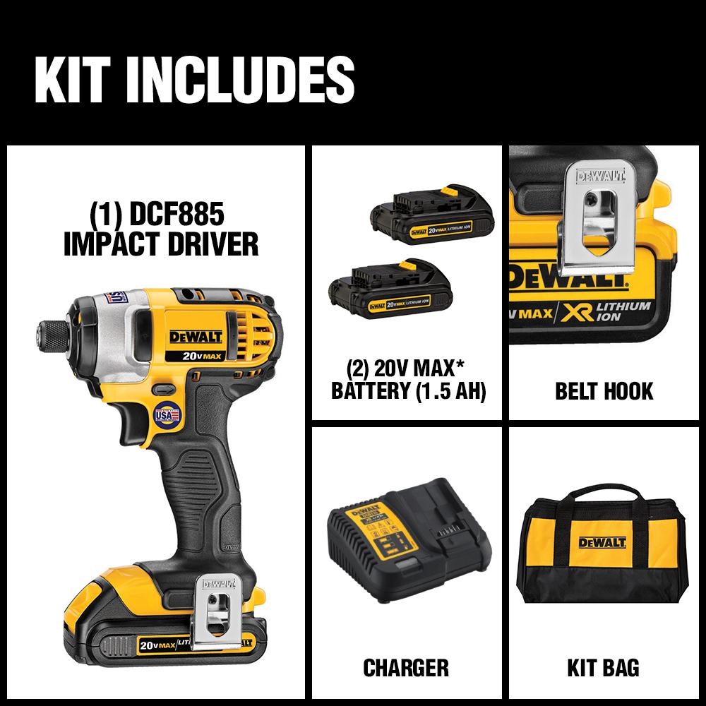 • Includes impact driver, two 20-Volt batteries, charger, belt clip and bag