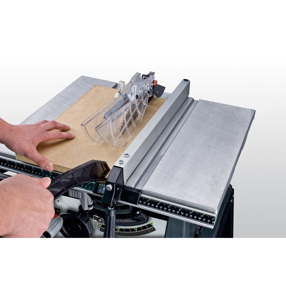 • Oversized sliding miter gauge for miter cuts from 0° to 45°