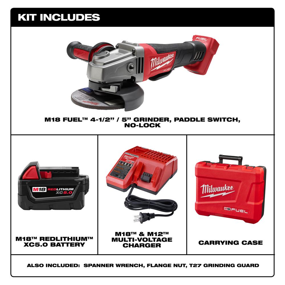 • Includes 1 M18 FUEL 4-1/2 in./5 in. grinder, paddle switch no-lock (bare tool) (2780-20), 1 M18 REDLITHIUM XC5.0 extended capacity battery pack (48-11-1850), 1 M18 and M12 multi-voltage charger (48-59-1812), 1 carrying case, 1 flange nuts, 1 wheel guard, 1 spanner wrench