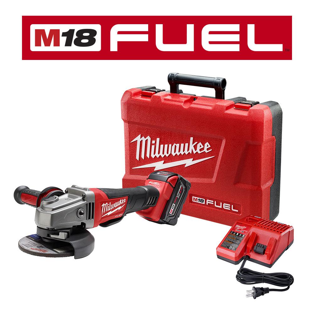 The worlds first cordless grinder delivers the power of a corded grinder with up to 2X more run time and up to 10X longer motor life. The M18 FUEL 4-1/2 in./5 in. Grinder supplies maximum sustained power to complete the toughest grinding, surface preparation and cutting applications. The POWERSTATE Brushless Motor provides up to 10X longer motor life and lower cost of ownership. The M18 REDLITHIUM XC5.0 Battery Pack delivers up to 4X more run time and 20% more power. The grinder features REDLINK PLUS Intelligence, the most advanced system of cordless power tool electronics, for maximum performance. The 18-volt lithium-ion grinders thin body design gives it optimized balance to rest easily in your hands. Tool-free accessory changes and guard adjustments mean less downtime during work. The grinder is built with the same tool body, gearing system and anti-vibration side handle as Milwaukee's legendary high-performance corded grinders for maximum durability on the job. Includes an M18 REDLITHIUM XC5.0 Extended Capacity Battery Pack and a carrying case. Grinding wheel sold separately.