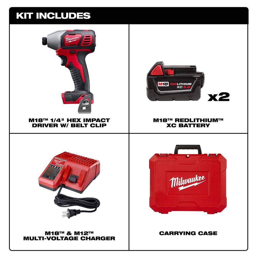 - Includes: (1) 2657-20 M18 2-speed 1/4 in. hex impact driver, (2) 48-11-1828 M18 REDLITHIUM XC extended capacity battery, (1) 48-59-1812 M18 and M12 multi-voltage charger (1) belt clip, and (1) carrying case