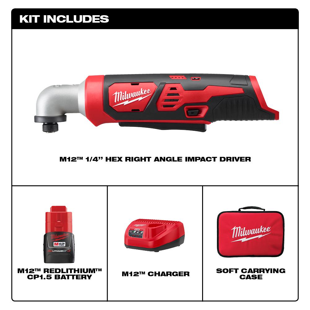 M12 12-Volt Lithium-Ion Cordless 1/4 in. Right Angle Hex Impact Driver Kit W/(1) 1.5Ah Batteries, Charger & Case