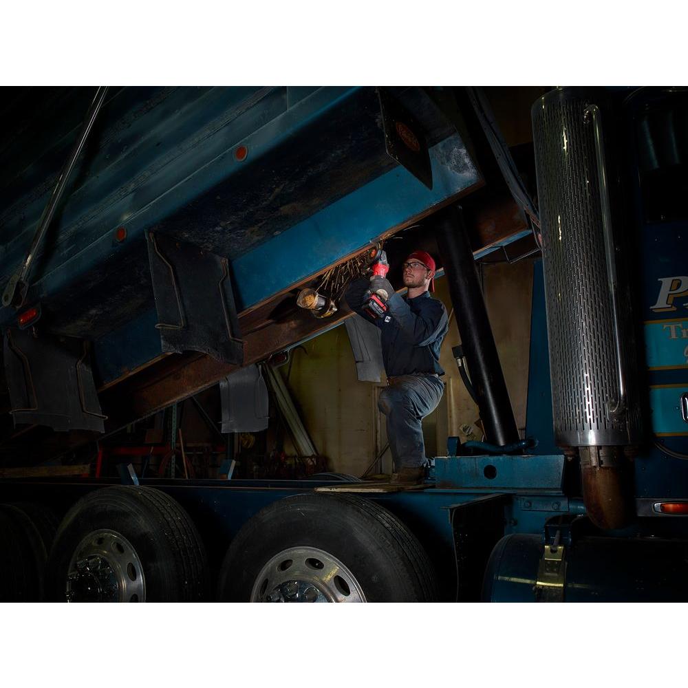 The world's first cordless braking grinder stops accessories in less than 2 seconds, delivers the power of a corded grinder and has up to 10X longer tool life. The M18 FUEL 4-1/2 in./5 in. Grinder supplies maximum sustained power to complete the toughest grinding, surface preparation and cutting applications. The POWERSTATE Brushless Motor provides up to 10X longer motor life and lower cost of ownership. The M18 REDLITHIUM XC5.0 Battery Pack delivers up to 4X more run time and 20% more power. The grinder features REDLINK PLUS Intelligence, the most advanced system of cordless power tool electronics, for maximum performance. A Rapid Stop Brake feature stops accessories in less than 2 seconds. The 18-Volt Lithium-Ion grinder’s thin body design gives it optimized balance to rest easily in your hands. Tool-free accessory changes using the FIXTEC nut and guard adjustments mean less downtime during work. The grinder is built with the same tool body, gearing system and anti-vibration side handle as Milwaukee’s legendary high-performance corded grinders for maximum durability on the job.