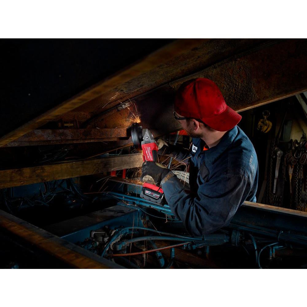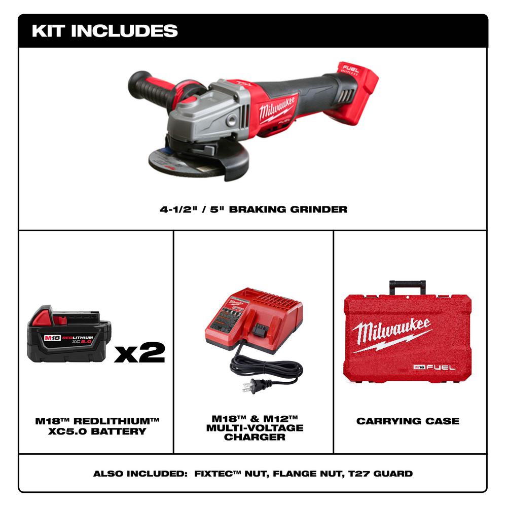 The world's first cordless braking grinder stops accessories in under 2 seconds, delivers the power of a corded grinder and has up to 10X longer tool life. The M18 FUEL 4-1/2 in./5 in. Grinder supplies maximum sustained power to complete the toughest grinding, surface preparation and cutting applications. The POWERSTATE Brushless Motor provides up to 10X longer motor life and lower cost of ownership. The M18 REDLITHIUM XC5.0 Battery Pack delivers up to 4X more run time and 20% more power. The grinder features REDLINK PLUS Intelligence, the most advanced system of cordless power tool electronics, for maximum performance. A Rapid Stop Brake feature stops accessories in under 2 seconds. The 18-Volt lithium-ion grinders thin body design gives it optimized balance to rest easily in your hands. Tool-free accessory changes using the FIXTEC nut and guard adjustments mean less downtime during work. The grinder is built with the same tool body, gearing system and anti-vibration side handle as Milwaukee's legendary high-performance corded grinders for maximum durability on the job. The kit includes 2 M18 REDLITHIUM XC5.0 Extended Capacity Battery Packs, a multi-voltage charger and carrying case. Grinding wheel sold separately.