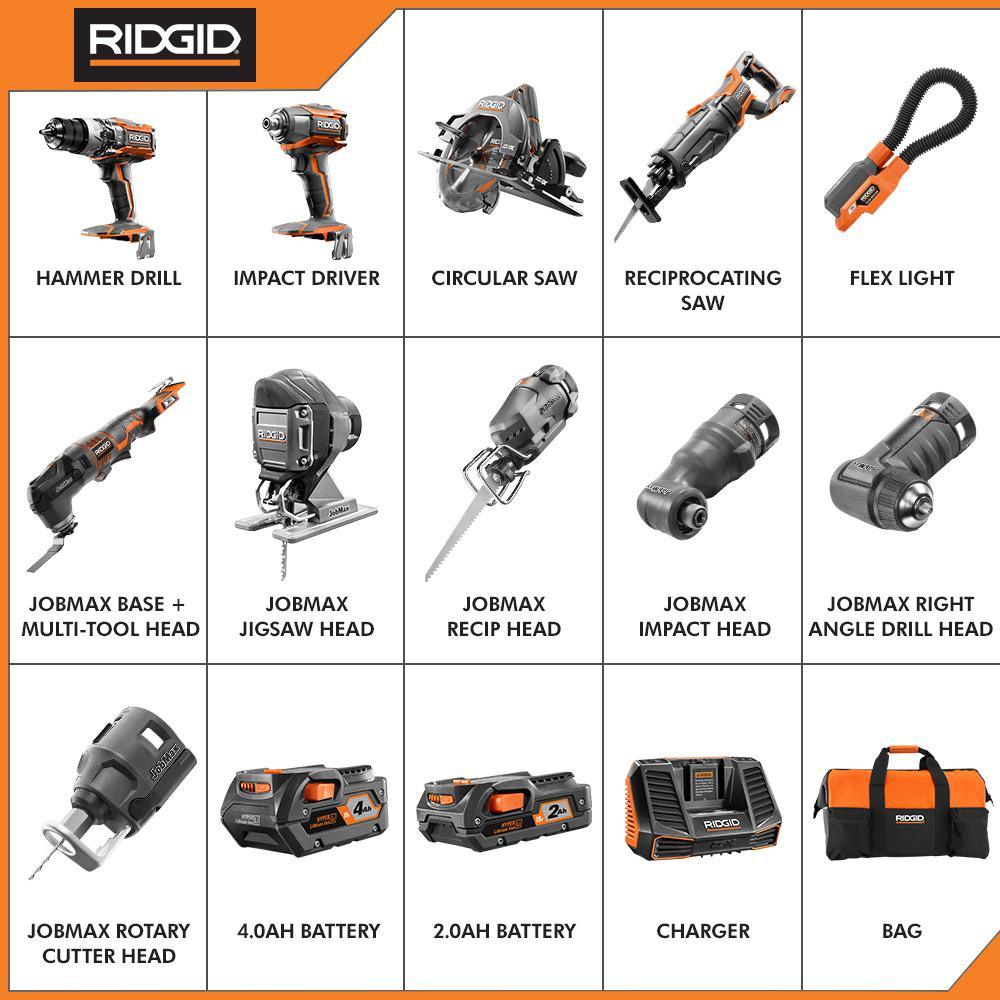 RIDGID introduces the 18-Volt Cordless 8-Piece Combo Kit with (1) 4.0 Ah Battery and (1) 2.0 Ah Battery, Charger, and Bag. With 8 common tools included, you get all the tools you need for the job in this one kit. Register this kit within 90 days of purchase and receive Free Batteries. Free Parts. Free Service. For Life. This kit includes a hammer drill, a 3-speed impact driver, a reciprocating saw, a circular saw, a JobMax multi-tool with assortment of interchangeable heads, a grinder, a work light, a 4.0 Ah battery, a 2.0 Ah battery, an 18-volt charger, a tool bag, and an operator's manual.