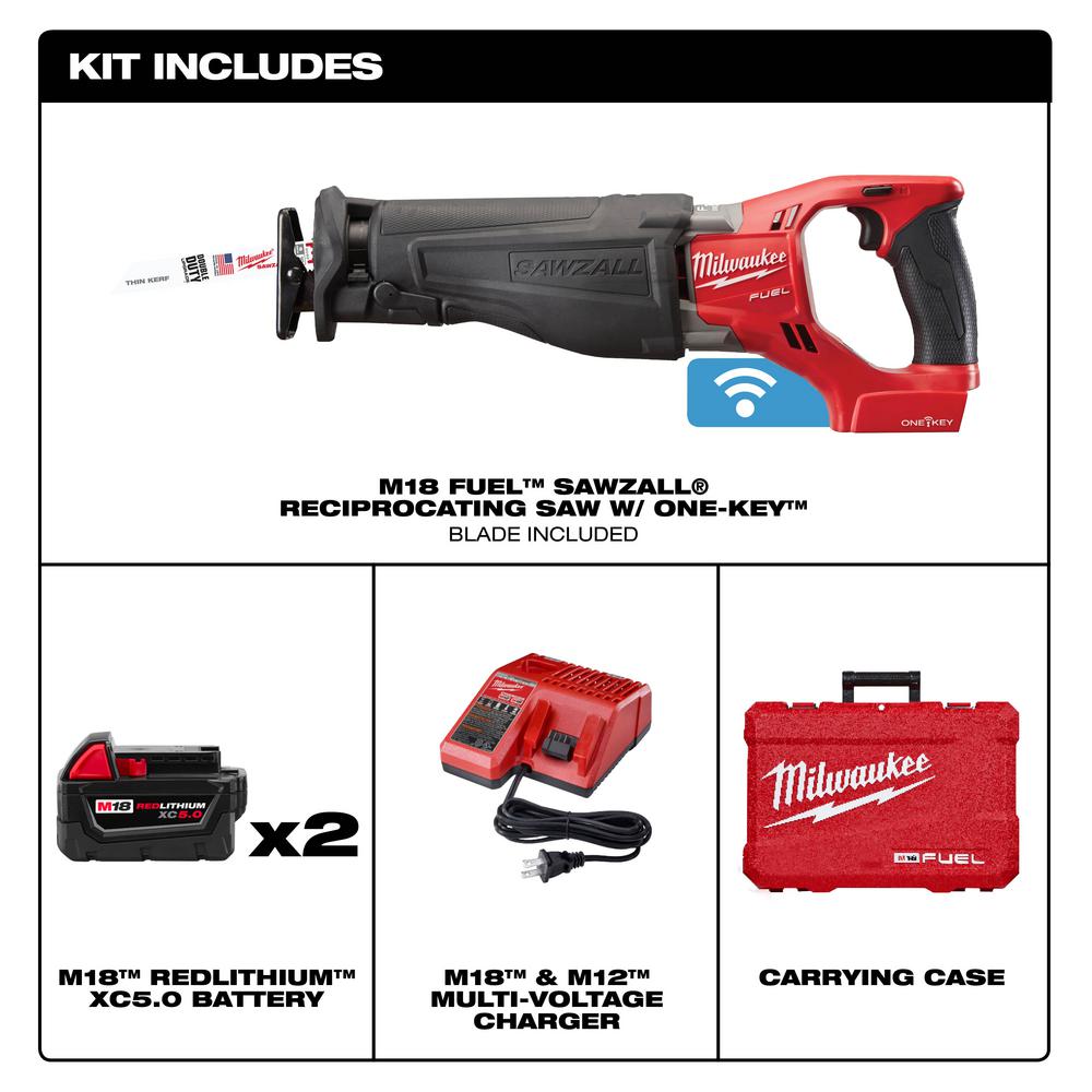 - Includes: one M18 FUEL SAWZALL reciprocating saw with ONE-KEY (tool only) (2721-20), two M18 REDLITHIUM XC5.0 extended capacity battery pack (48-11-1850), one M18 and M12 multi-voltage charger (48-59-1812), one carrying case, one blade