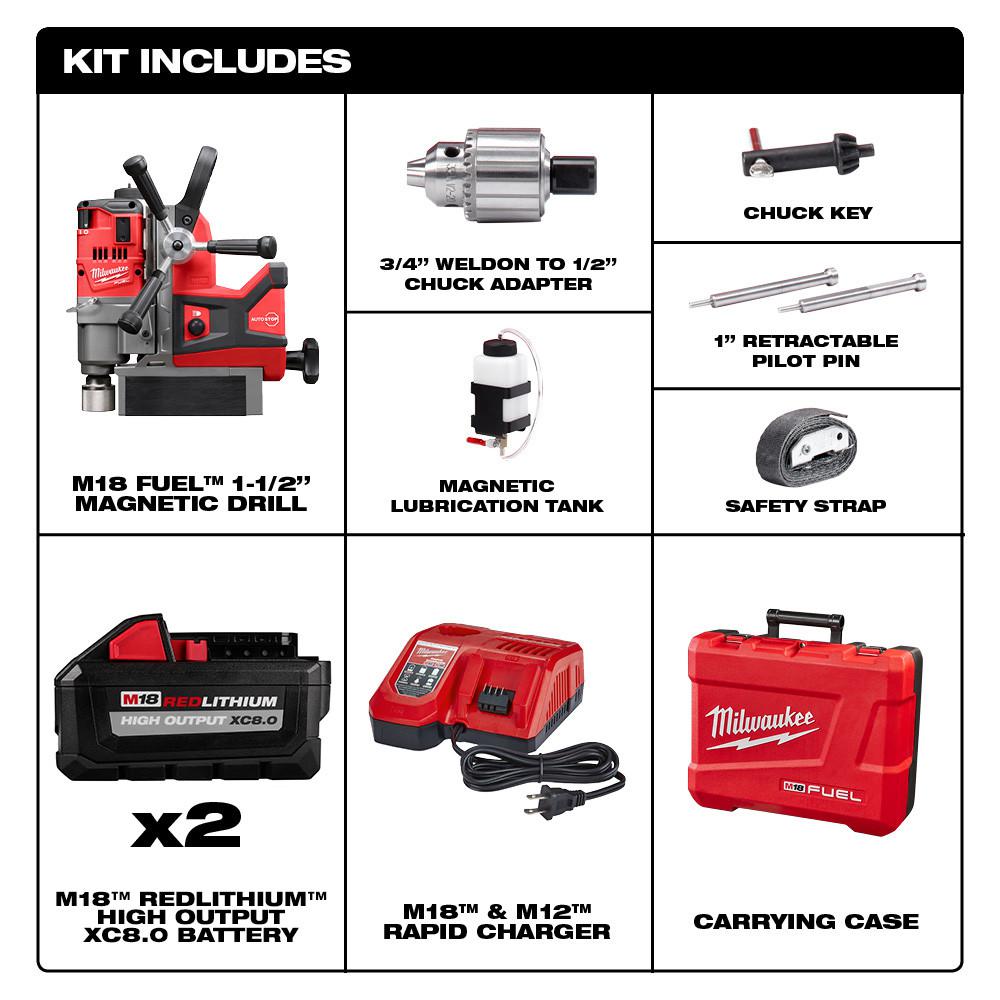 • Includes: (1) M18 1-1/2 in. magnetic drill kit (2787-22); (2) M18 REDLITHIUM HIGH OUTPUT XC8.0 battery (48-11-1880; (1) M18 and M12 rapid charger (48-59-1808); (1) 3/4 in. Weldon to 1/2 in. chuck adapter; (1) chuck key; (1) magnetic lubrication tank; (1) safety strap; (2) 1 in. retractable pilot pin; (1) carrying case
