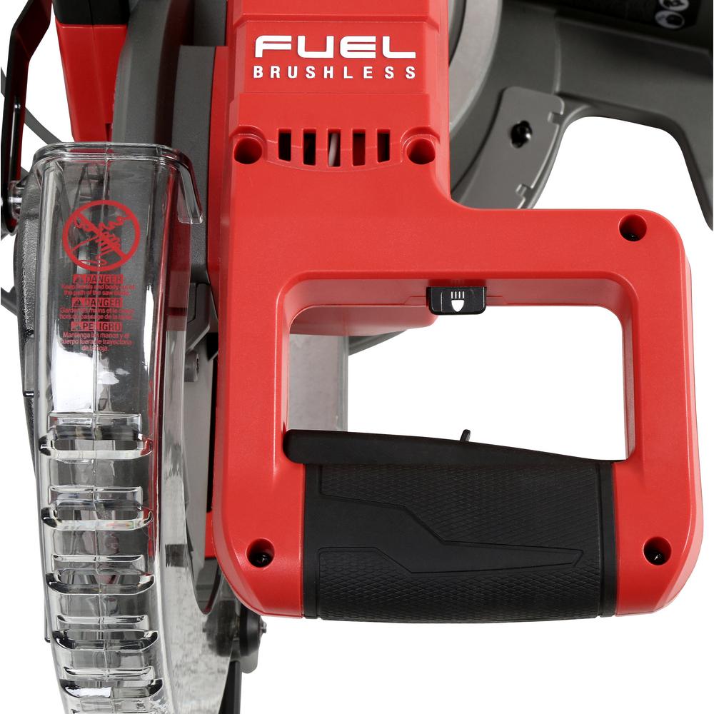 The M18 FUEL 10 in. Dual Bevel Sliding Compound Miter saw was designed to meet the demanding needs of professional carpenters and remodelers. Delivering greater capacity than many corded 10 in. sliding miter saws and the POWERSTATE Brushless motor delivering corded cutting performance the 2734 provides users a solution to replace their corded miter saws. The REDLITHIUM HD9.0 battery pack delivers up to 400 cuts per charge making the saw capable of lasting an entire day on site with only one pack. Premium features like an adjustable stainless steel detent plate, cam locking miter system, easy access bevel adjustment lever and both a detent override lock and chop lock lever located on the front of the tool the M18 FUEL miter saw is designed for easy operation and repeatable, accurate cuts.