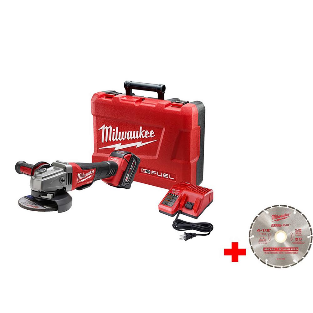 - includes (1) m18 FUEL 4-1/2 in. / 5 in. grinder, paddle switch no-lock (bare tool) (2780-20), (1) m18 redlithium xc5.0 extended capacity battery pack (48-11-1850), (1) m18 and m12 multi-voltage charger (48-59-1812), (1) carrying case, (1) flange nuts, (1) wheel guard, (1) spanner wrench, (1) 4-1/2 in. steel head diamond cut off blade(49-93-7805)