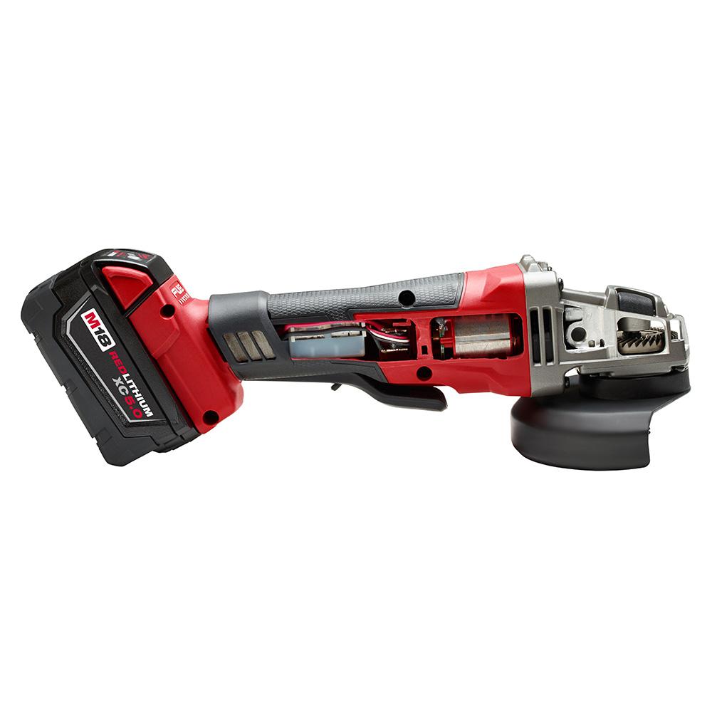 The world's first cordless grinder with corded performance utilizing a POWERSTATE Brushless Motor, the M18 FUEL 4-1/2 in./5 in. Grinder, Paddle Switch No-Lock, delivers maximum sustained power to complete the toughest grinding, surface prep and cutting applications. It provides a lower cost of ownership with up to 10 times longer motor life. REDLITHIUM XC5.0 Battery Technology provides superior pack construction, electronics and performance. It delivers double the run time and more work over pack life than any battery on the market. REDLINK PLUS Intelligence has the most advanced system of cordless power tool electronics, providing optimized performance, electronic clutch and overload protection using total system communication between tool, battery and charger. The thin body design delivers optimized balance to rest easily in the user's hands. It is a tool-free-tool; no wrench, no screwdriver, no problem. The tool-free accessory change lets you easily change all accessories without a wrench and a tool-free adjustable guard allows for quick guard installations and adjustments. The M18 FUEL 4-1/2 in./5 in. Grinder, Paddle Switch No-Lock provides corded durability in a cordless tool by utilizing the same metal housing, gearing system, guards, flanges and anti-vibration side handles as legendary high performance corded grinders. Includes a 4-1/2 in. Steel Head Diamond Cut Off Blade (49-93-7805).
