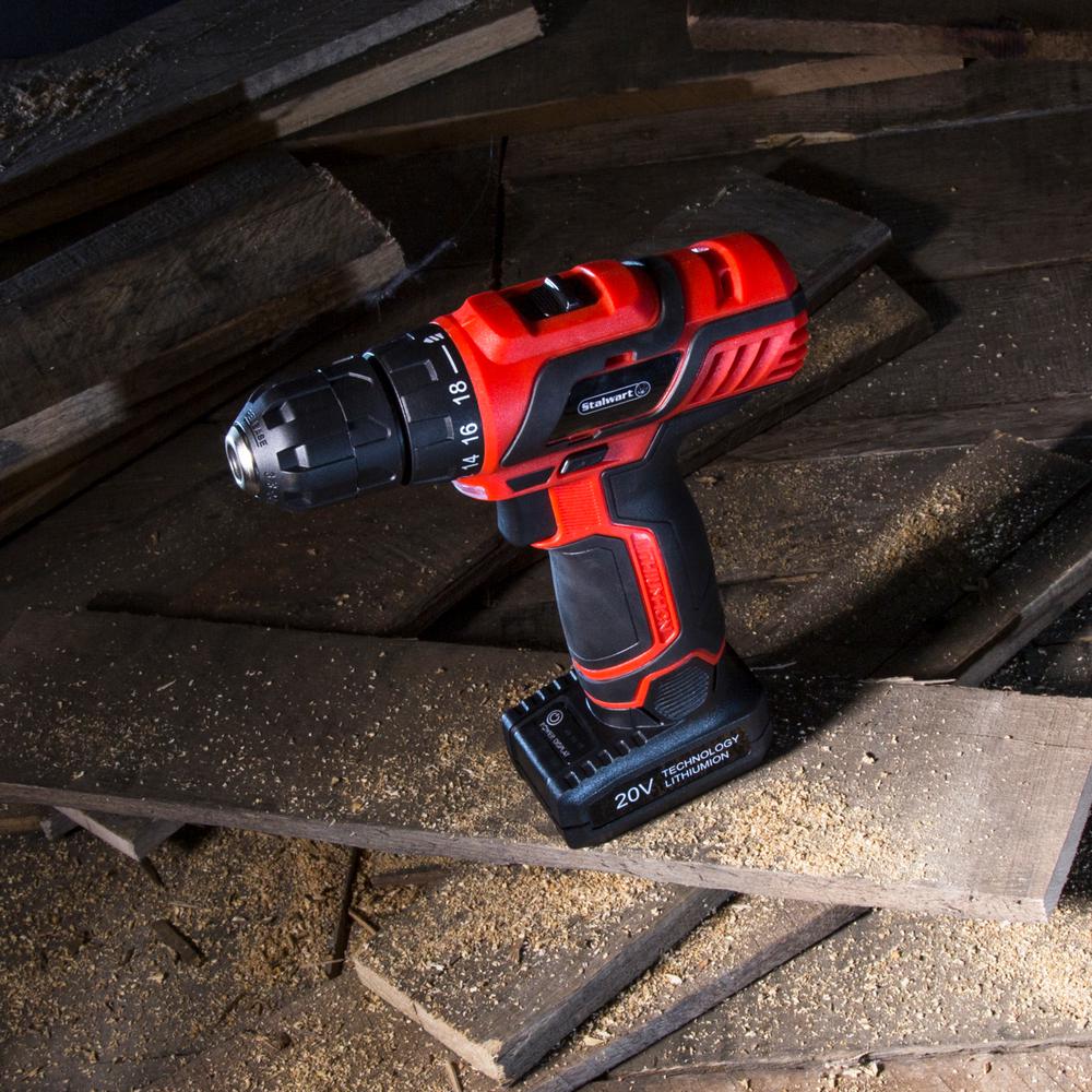 The Stalwart 62 piece 20-Volt Lithium-Ion 2 speed drill set makes it easy to tackle DIY and household tasks. This drill comes with an LED light to illuminate what you're working on, that is activated when the trigger is pulled. This 62 piece kit has a great variety of hand tools and accessories for all you home project needs and includes a rugged and sturdy case that is ideal for storage, organization and portability.