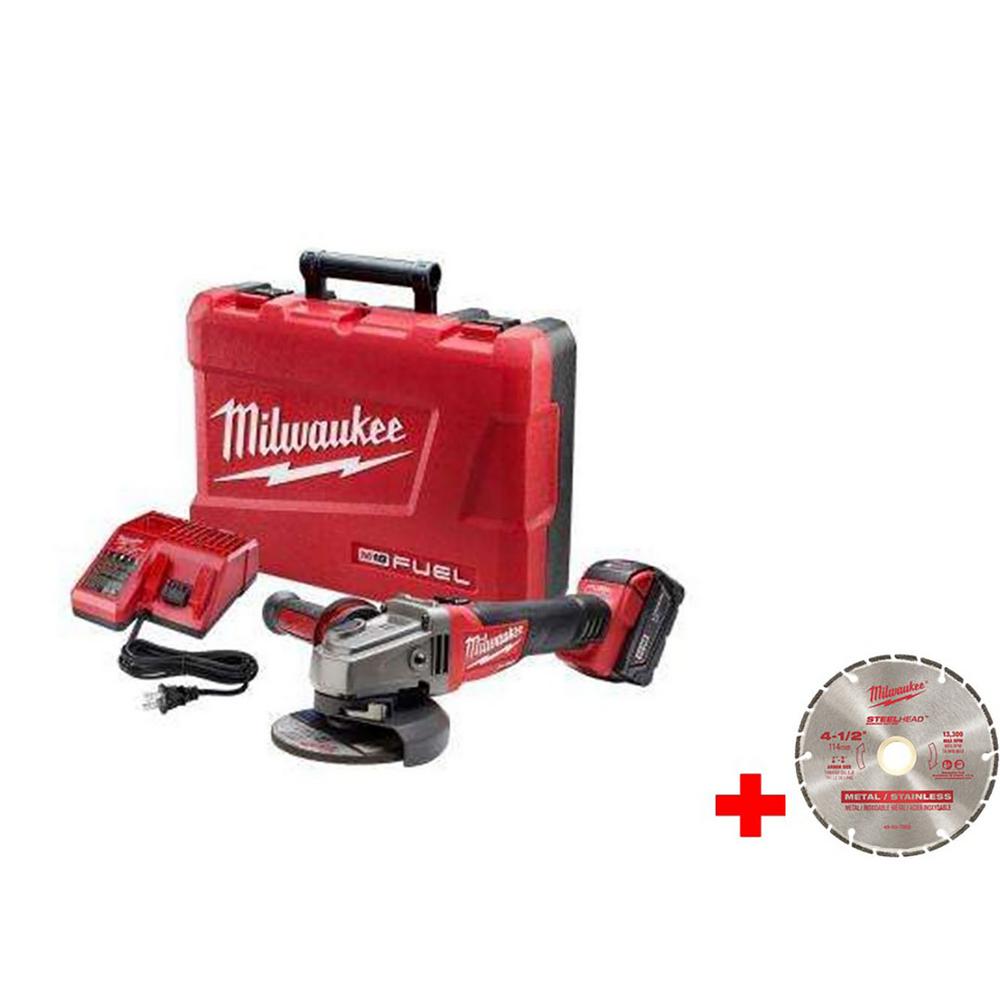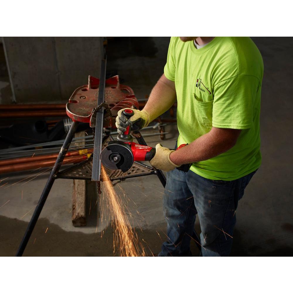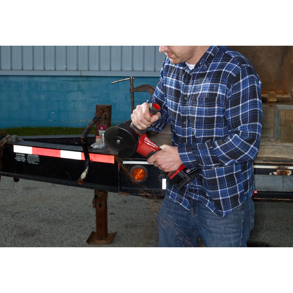 Power to Grind: World's first cordless grinder with corded performance. Utilizing a POWERSTATE Brushless Motor, the M18 FUEL 4-1/2 in./5 in. Grinder, Paddle Switch No-Lock, delivers maximum sustained power to complete the toughest grinding, surface prep and cutting applications while providing a lower cost of ownership with up to 10X longer motor life. REDLITHIUM XC5.0 Battery Technology provides superior pack construction, electronics and performance deliver 2X more run-time and more work over pack life than any battery on the market. REDLINK PLUS Intelligence has the most advanced system of cordless power tool electronics, providing optimized performance, electronic clutch and overload protection using total system communication between tool, battery and charger. The thin body design delivers optimized balance to rest easily in the users hands. 100% tool-free-tool - No wrench, No Screwdriver, no problem: Tool-free accessory change to easily change all accessories without a wrench and a toll-free adjustable guard for quick guard installations and adjustments. The M18 FUEL 4-1/2 in./5 in. Grinder, Paddle Switch No-Lock proves corded durability in a cordless tool by utilizing the same metal housing, gearing system, guards, flanges and anti-vibration side handles as legendary high performance corded grinders. Includes a 4-1/2 in. Steel Head Diamond Cut Off Blade (49-93-7805).