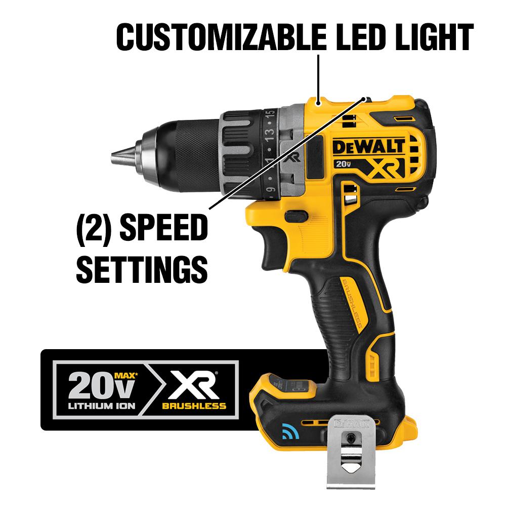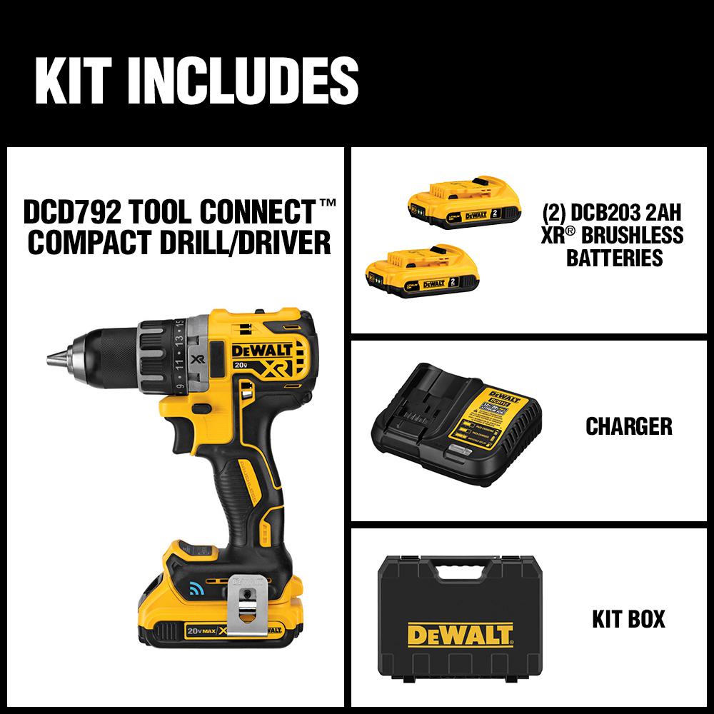 This XR (R) Brushless Cordless Compact Drill/Driver has integrated Bluetooth (R) technology, so you can connect to the DEWALT (R) Tool Connect app with or without a Tool Connect battery. You can also customize the tool to your preferences and specific applications. The Tool Connect and Inventory Manager app help manage and track tools, material, equipment, and other assets. Know where everything is and who has them. Even receive tool diagnostics. Use Tool Connect tools along with Tool Connect batteries, the Tool Connect Connector, and the Tool Connect Tag for a complete inventory management solution.