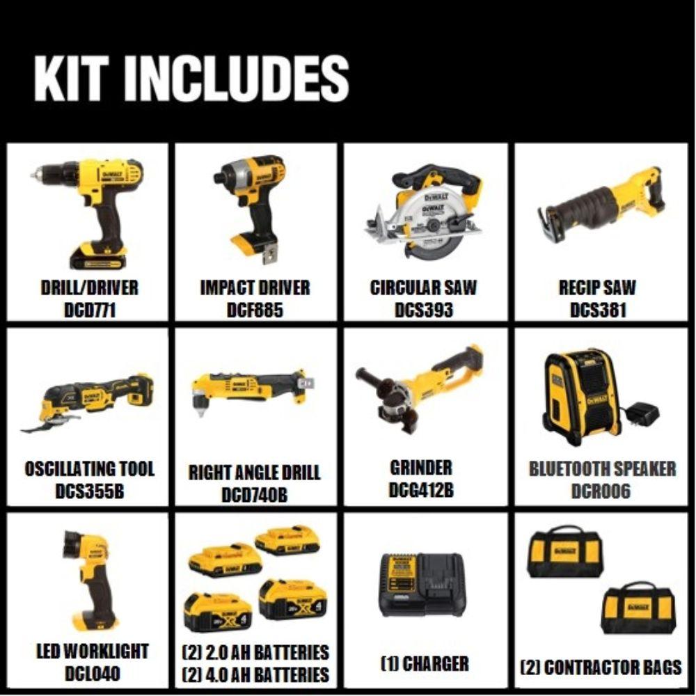 The DEWALT 9-Tool Combo Kit (DCK940D2) is ideal for just about any application on the job site or at home. This kit features a drill driver, impact driver, reciprocating saw, circular saw, oscillating tool, grinder, right angle drill, Bluetooth speaker and work light. The DCK940D2 is backed by a DEWALT 3-year limited warranty for added peace of mind, so you can count on tools that are built to last. for a limited time, get a bonus Battery 2-Pack with purchase.