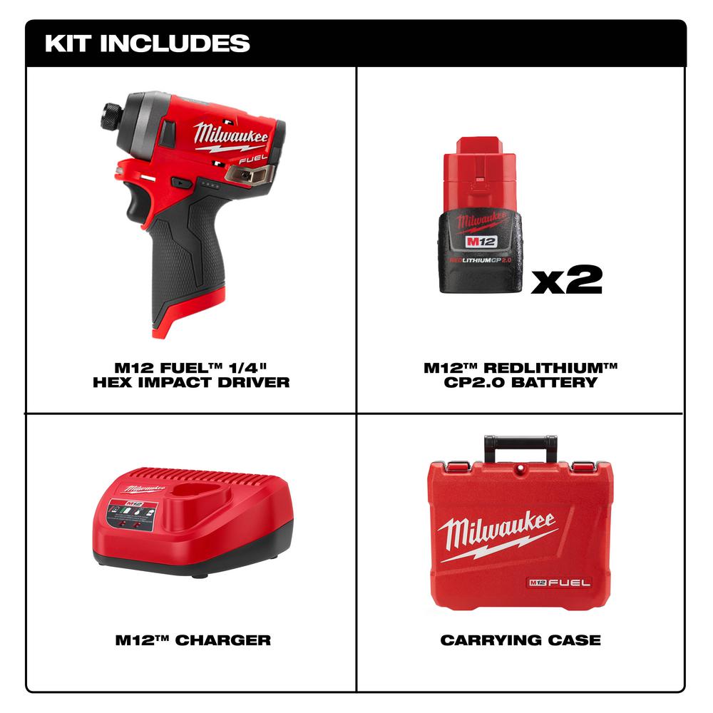 - Includes: one M12 FUEL 1/4 in. hex impact driver, 2 M12 REDLITHIUM 2.0 compact batteries, 1 M12 lithium-ion charger, 1 carrying case and 1 removable belt clip