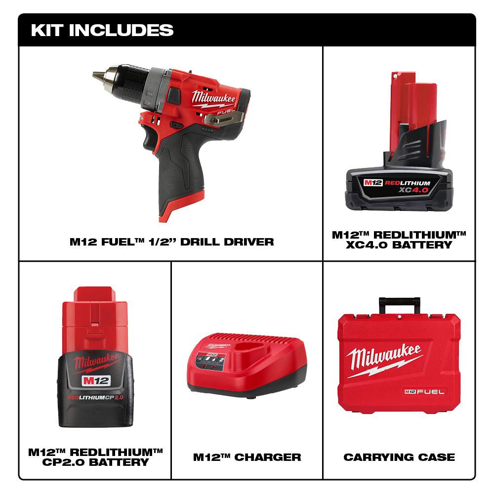 • Includes: 2503-20 1/2 in. drill driver, M12 REDLITHIUM 2.0 compact battery pack, M12 REDLITHIUM XC 4.0 extended capacity battery pack, charger, belt clip and carrying case
