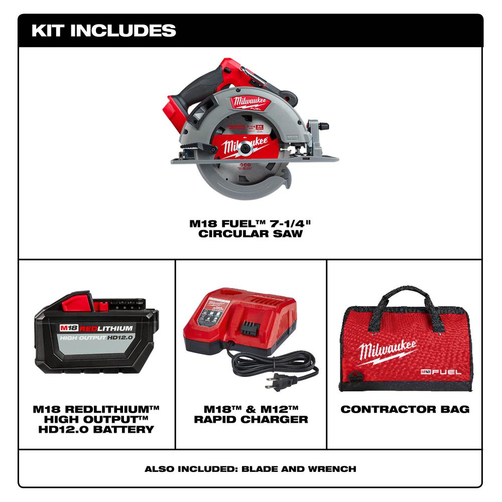 The Milwaukee M18 FUEL brushless cordless circular saw was designed for carpenters, remodelers and general contractors that rely on durable and dependable tools. This rechargeable battery powered circular saw delivers the same power and cuts faster than a 15Amp corded saw, delivers up to 750 cuts per charge. The POWERSTATE Brushless Motor was purposely built for the M18 FUEL 7-1/4 in. Circular Saw to provide the power and performance of a 15Amp corded circular saw. Built-in REDLINK PLUS Intelligence ensures optimal tool performance and provides overload protection to prevent damage to the tool and battery during heavy applications while still maintaining compatibility across the entire M18 System. The REDLITHIUM High Output HD12.0 Battery Pack provides 50% more power and runs 50% cooler versus standard REDLITHIUM HD packs. Its superior pack construction provides the industry's best protection against jobsite conditions. In addition to the circular saw, this kit comes with one M18 REDLITHIUM High Output HD12.0 battery pack (48-11-1812), one M18/M12 multi-voltage rapid charger (48-59-1808), a durable contractor bag, one ready-to-use circular saw blade, and one blade wrench