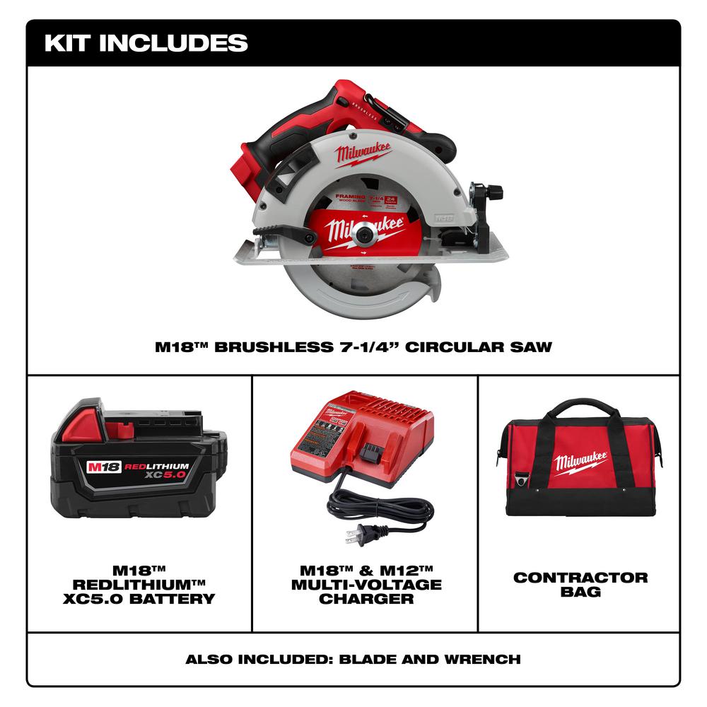 • Includes: M18 Brushless 7-1/4 in. circular saw, 1 M18 REDLITHIUM XC5.0 battery, M18 and M12 charger, blade, wrench and contractor bag