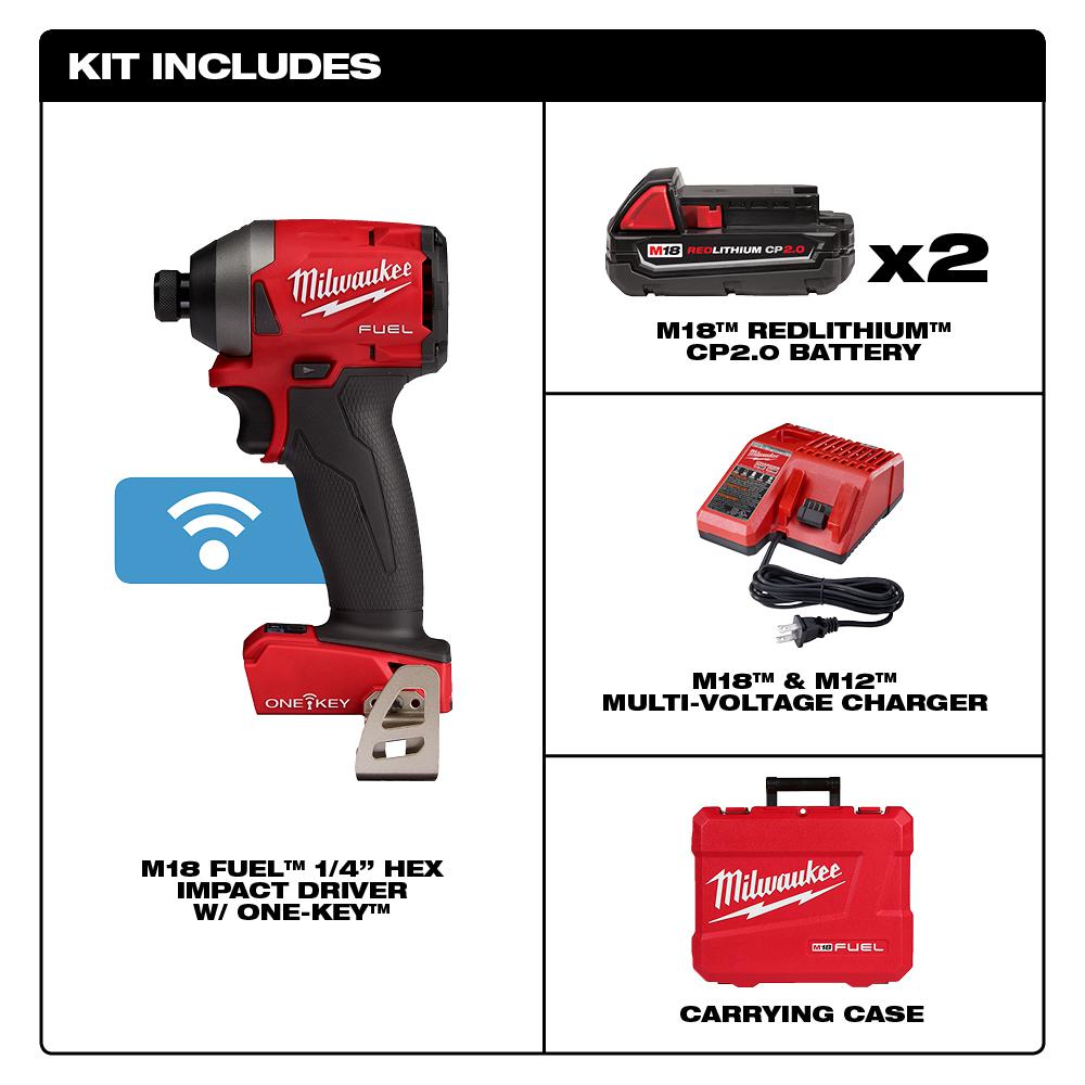 - Includes: M18 FUEL 1/4" Hex Impact Driver w/ ONE-KEY (Tool Only), (2) M18 REDLITHIUM CP2.0 Batteries, (1) M18 & M12 Multi-Voltage Charger, (1) Belt Clip, (1) Bit Holder, (1) Carrying Case