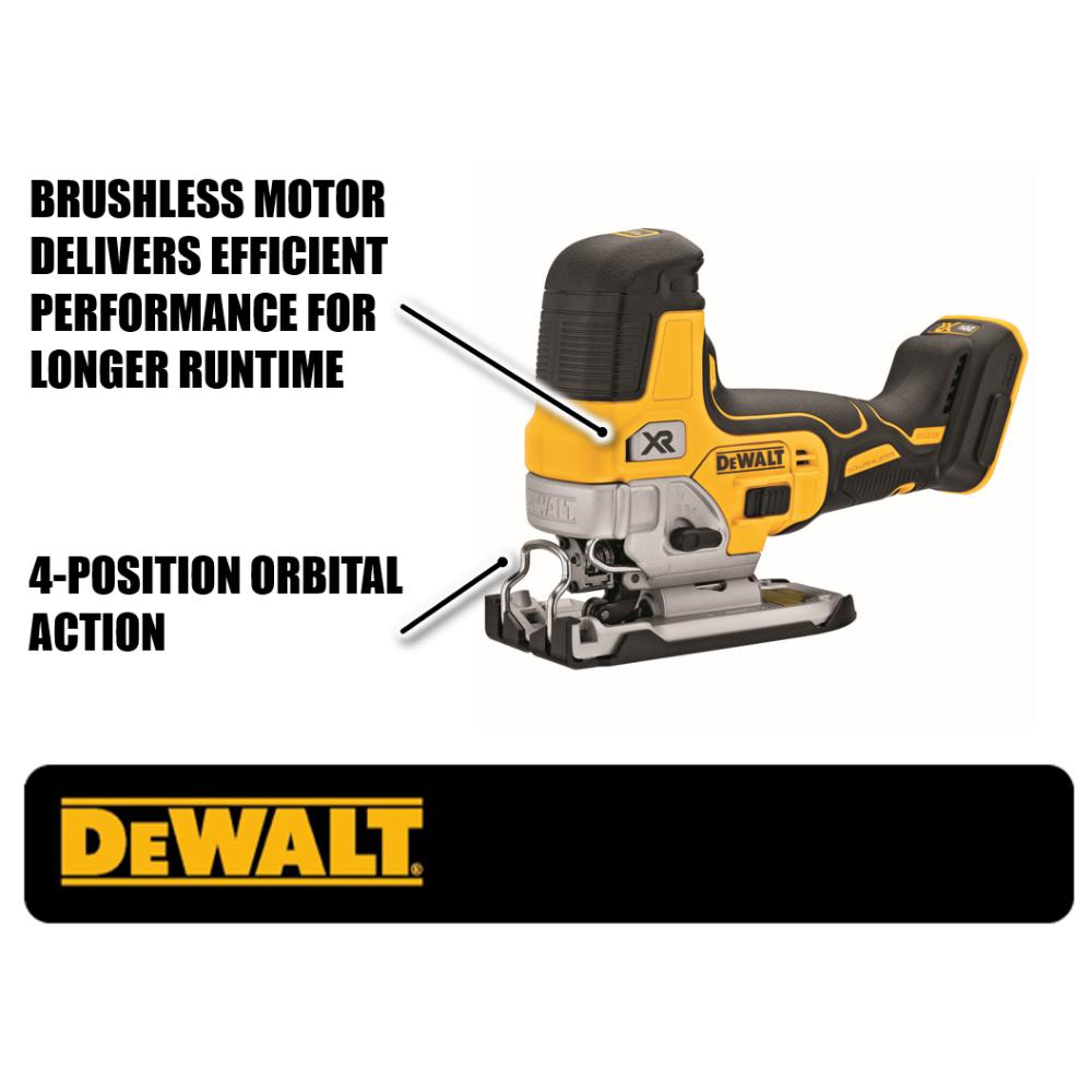 Our 20-Volt MAX XR Cordless Barrel Grip Jigsaw features an efficient motor for powerful performance and extreme runtime. Precisely control blade speed up to 3,200 SPM with the variable speed trigger and dial, for professional results no matter what you're cutting. 4-position orbital action lets you adjust for optimal cutting of a variety of materials. A bright LED light illuminates dim work surfaces and makes it easy to follow cut lines. The updated all-metal, lever-action keyless blade clamp is designed for quick and easy blade changes of t-shank jig saw blades. Also keyless, the shoe bevel is easy to adjust with detents at 0, 15, 30 and a positive stop at 45. A removable shoe cover helps protect materials from scratches and an integrated dust blower helps remove dust and debris from your line of sight as you cut.