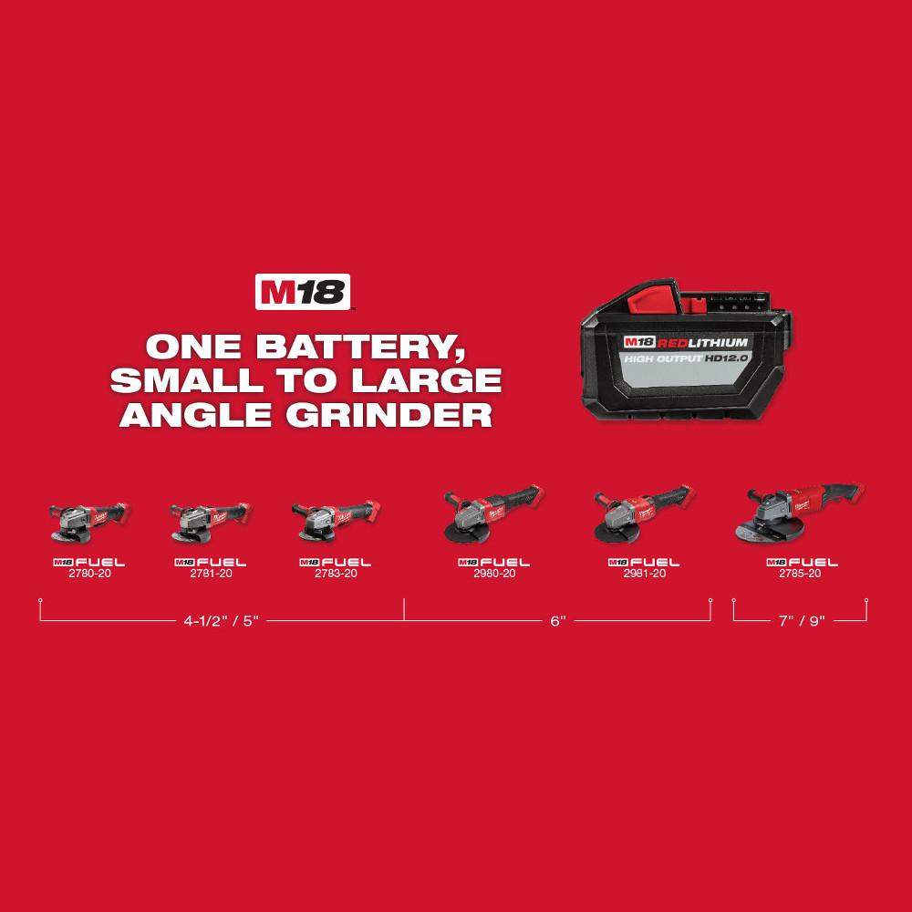 • Includes: 2980-20 M18 FUEL 4-1/2 in. - 6 in. grinder, paddle switch, no-lock, two M18 REDLITHIUM HIGH OUTPUT XC6.0 Batteries Type 27, 6 in. guard, side handle, FIXTEC nut, backing flange, wrench