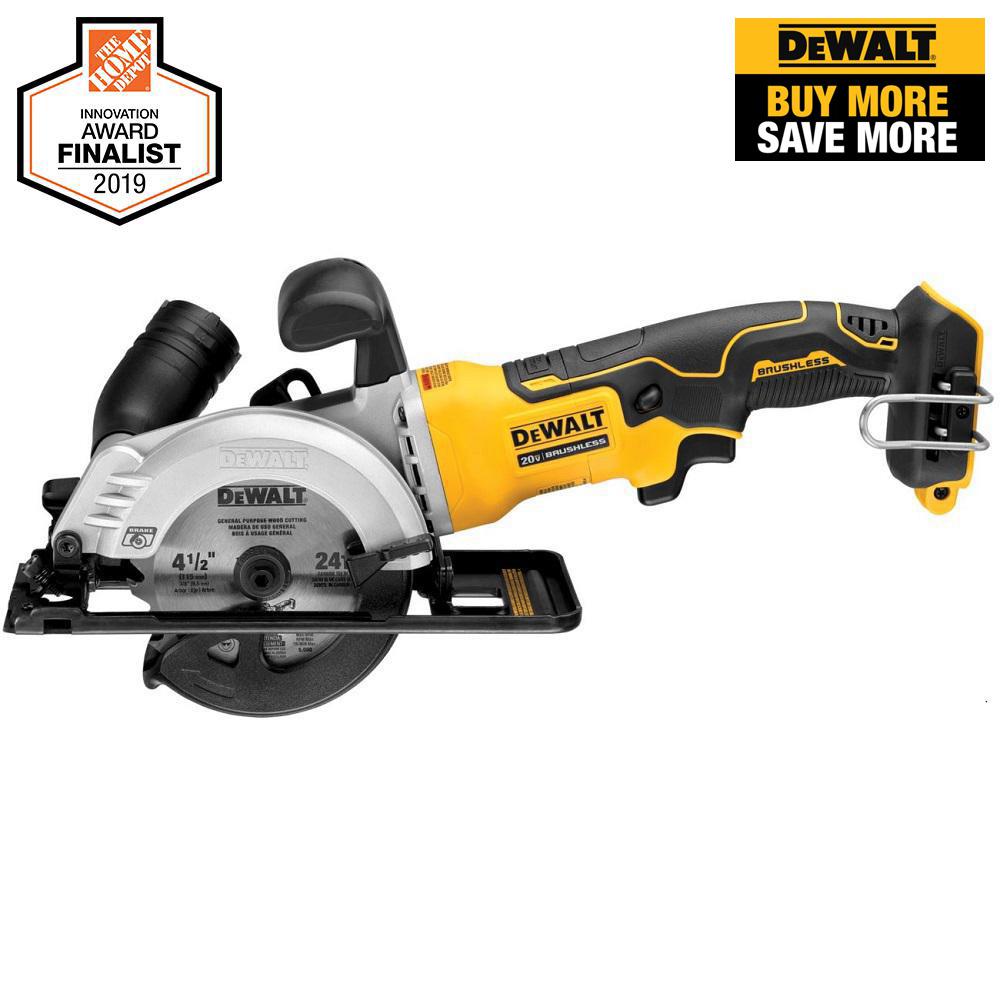 This brushless cordless 4-1/2 in. circular saw comes with 1 blade, rip fence, dust port adaptor and blade change key. The DCS571 features a bevel gear design allowing users to cut 2X material at 90° and 1X material at 45°. With convenient on-board blade key storage users can change blades with minimal hassle. Elongated handle optimizes reach for rip cutting OSB and plywood. With the DCB205, you can cut up to 339 lin. ft. of 3/4 in. OSB. Battery and charger sold separately.