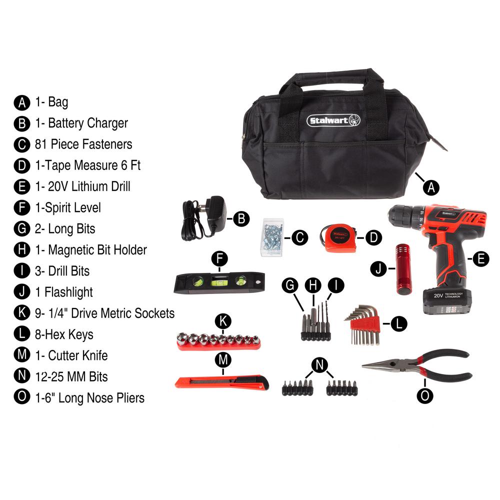 • Includes: 20-Volt lithium drill, twelve 25 mm bits, 3 drill bits, 1 magnetic bit holder, 1 flashlight, 2 long bits, 1 flashlight, battery charger, nine 1/4 in. metric sockets, 6 in. L nose pliers, 81 fasteners