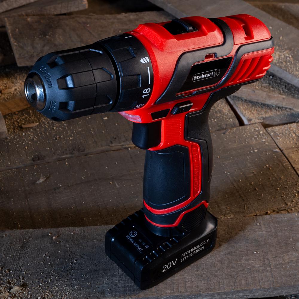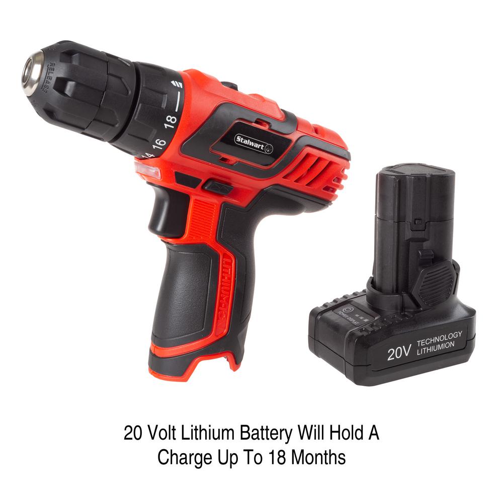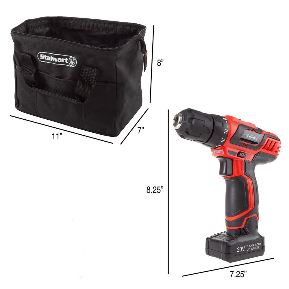 Never be left without the proper tool for the job with the 20-Volt Lithium Cordless Drill and 122-piece Accessory Set by Stalwart. The accessory set has everything from screwdriver bits to wood and metal drill bits. The drill itself is powered by a 20-Volt lithium ion battery that gives a longer use time and holds a charge better than nickel-cadmium batteries. The handle is ergonomic and comes with a rubberized coating to enhance comfort and reduce user fatigue. The drill has a 3/8 in. keyless chuck for fast, convenient bit installation and removal and 18 plus 1 torque settings for precision drilling and driving in any material. The entire kit comes in a 600D Oxford cloth carrying bag to keep the accessories organized and make the kit ideal for travel. The bag has an extra wide opening to provide easy access to your drill and accessories. The built-in LED light indicates whether the battery needs to be charged or is ready to use.