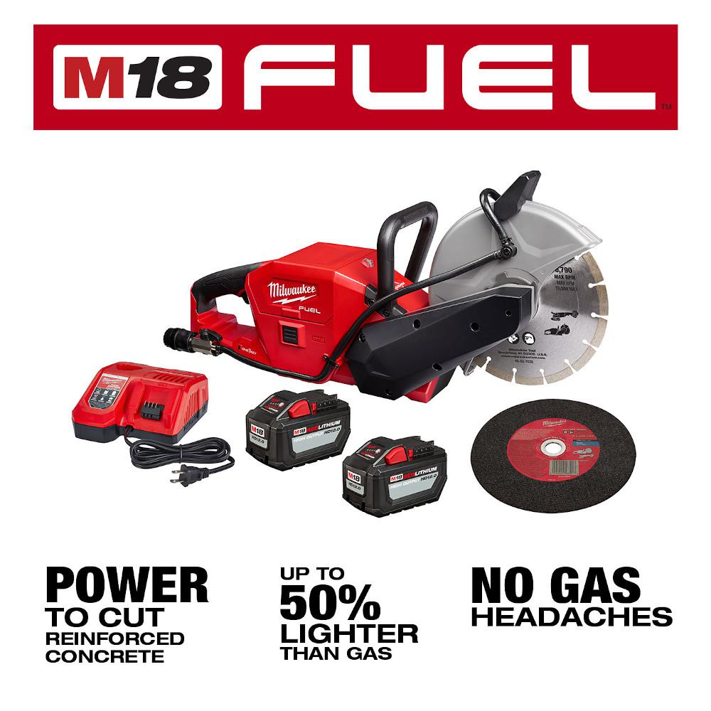 The Milwaukee M18 FUEL Brushless Cordless 9 in. Cut Off Saw with ONE-KEY is an extremely versatile solution for cutting a large variety of materials. The M18 FUEL 9 in. Cut Off Saw runs on Milwaukee's M18 REDLITHIUM batteries instead of using gas like most traditional cut off saws. This saw delivers the Power To Cut Reinforced Concrete as well as a large variety of other metal and masonry materials. It delivers this performance while still being Up To 50% Lighter Than Gas saws that dominate the market today. By utilizing Milwaukee's M18 REDLITHIUM HIGH OUTPUT HD12.0 Battery, this saw delivers No Gas Headaches. It produces no fumes so it can be used indoors, it starts up instantly, it eliminates the need to mix gas and oil and there is no gas engine maintenance. The battery will also work on any of Milwaukee's other 200+ M18 solutions. The M18 FUEL 9 in. Cut Off Saw also has ONE-KEY integrated so users can wirelessly connect the tool with their smartphone to track and manage the tool.