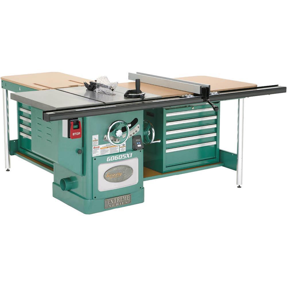 This Extreme Table Saw is ideally suited to handling large panels without blinking an eye. A right-hand and rear mounted extension table supports the widest panels before during and after the cut, and the large rail mounted switch control won't get lost under the panel. Other features include ample storage shelves, a user friendly blade guard, a riving knife, a digital readout for blade angle and an efficient dust management system that includes an internal dust port and sloped cabinet floor that directs saw dust into the 4 in. dust port. Enjoy all of the innovative features this big capacity saw has to offer. CSA certified meeting CSA C22.2 #71.2-08, CSA C22.2 #105-1953, and UL 987 standards.