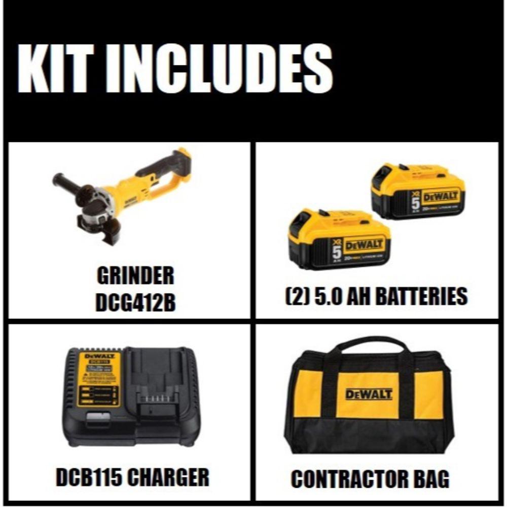 The DEWALT 20-Volt Max Lithium-Ion 4-1/2 in. Cut Off Tool (model DCG412B, tool-only) is ideal for a wide range of construction, maintenance, repair and automotive applications. This versatile tool is designed for electricians, mechanical contractors, ironworkers and automotive mechanics tasked with cutting, grinding and finishing metallic materials. It delivers 8000 RPM for fast cutting and grinding applications and features a quick-change wheel release that enables wrench-free wheel changes. Additionally, the device offers a tool-free adjustable guard that allows safe and quick repositioning of the guard without the need for a tool or key. A 2-position side handle offers increased control and comfort. Keep your DEWALT 20-Volt tools running longer with the 20-Volt MAX Lithium-Ion Premium Battery and Charger Kit. The batteries are compatible with the complete line of DEWALT 20-Volt MAX tools. The charger is compatible with all DEWALT 12-Volt and 20-Volt MAX Lithium-Ion battery packs, this charger is easy to use, quiet and exceptionally stable with its 4 plastic feet. This kit includes 2 DCB205 batteries, DCB115 charger and kit bag.