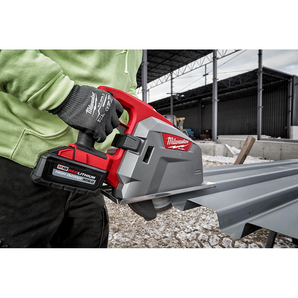The Milwaukee M18 FUEL 8 in. Metal Cutting Circular Saw Kit generates 15 Amp corded power, faster cuts than 15 Amp corded metal circular saws and delivers up to 120 ft. of cutting corrugated decking per charge. The M18 FUEL 8 in. Metal Cutting Circular Saw combines Milwaukee's legendary performance and durability with the portability of the M18 platform. The POWERSTATE Brushless Motor provides 4,000 RPM for faster cutting and REDLINK PLUS Intelligence ensures maximum performance and protection from overload, overheating and over-discharge. The M18 REDLITHIUM HIGH OUTPUT XC 8.0 battery delivers 50% more power and runs 50% cooler than M18 REDLITHIUM XC Batteries while still being fully compatible across the M18 platform. With this saw users get a cut capacity of 2-9/16 in. to power through the most demanding applications at a larger capacity than any previous cordless metal cutting circular saws.