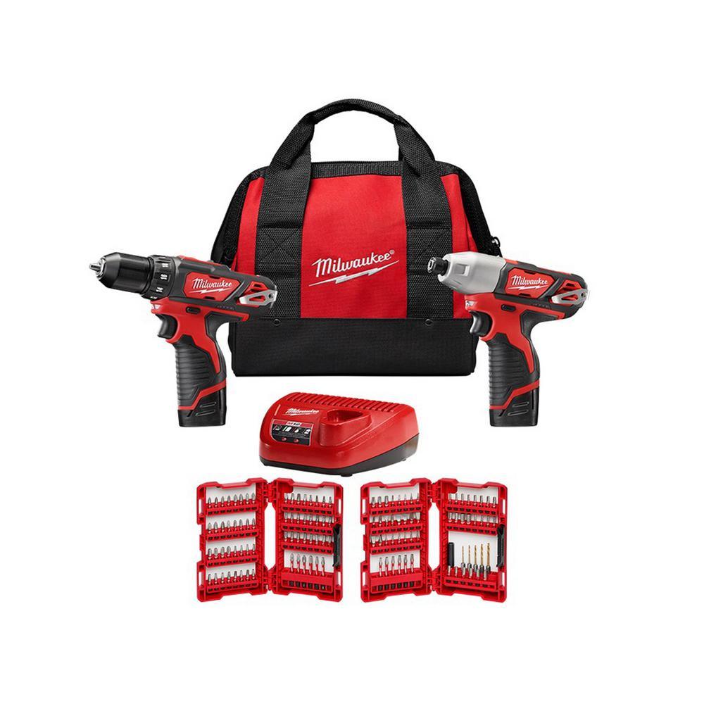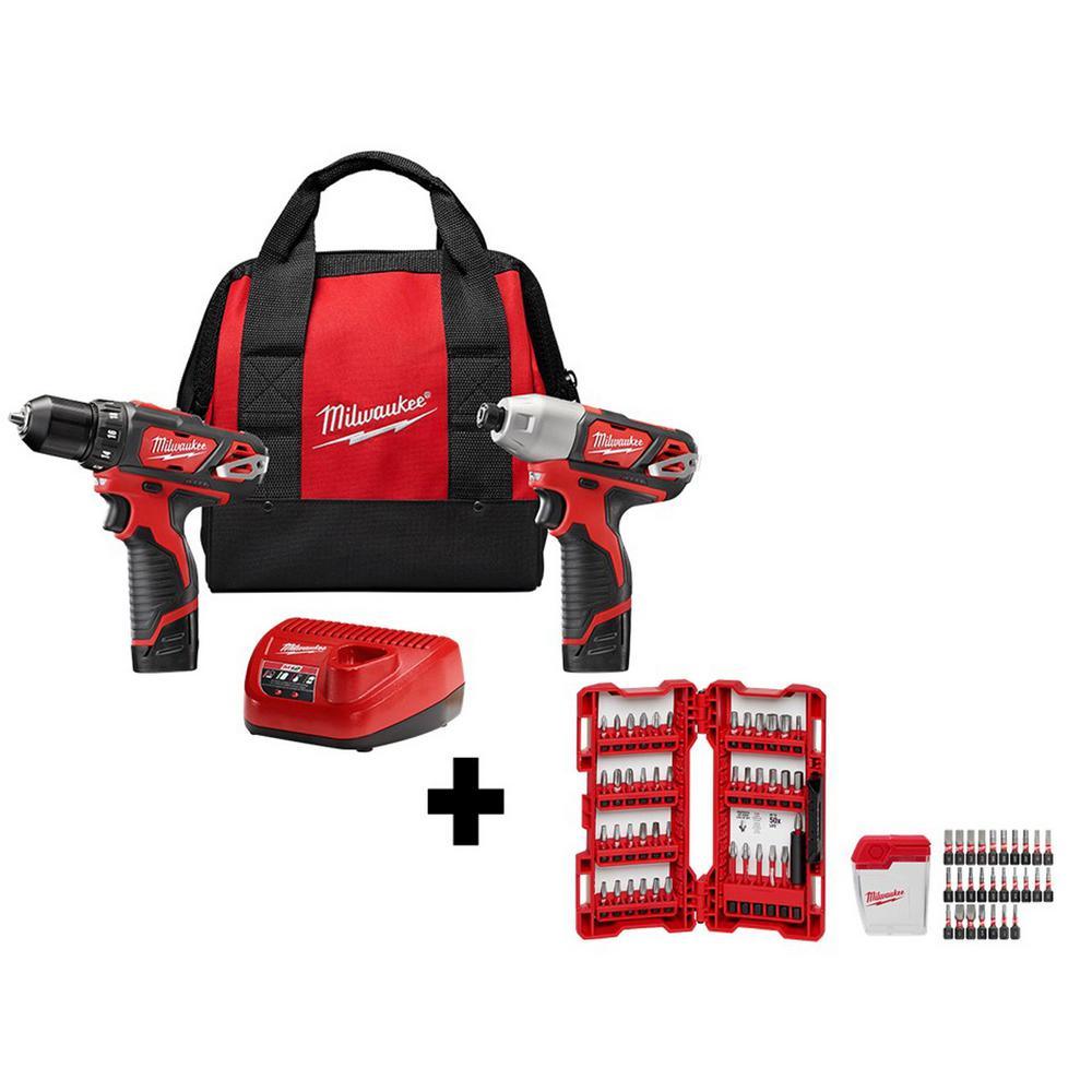 The Milwaukee M12 2-Tool Combo Kit includes the M12 3/8 in. Drill/Driver (2407-20) and the M12 1/4 in. Hex Impact Driver (2462-20). The powerful compact cordless drill driver delivers 275 in./lbs. of torque - up to 25% more torque than the competition and 0 RPM to 400 RPM/0 RPM to 1,500 RPM. The impact driver's high-performance motor gives users 0-2,500 RPM for increased fastening speed. The innovative M12 cordless lithium-ion system is designed to provide users with the power and torque required for professional applications, in a size that allows users to reach the tightest and toughest spaces. Both compact power tools are powered by REDLITHIUM batteries, providing users with unmatched power, speed and tool belt portability. In addition to the 2 cordless M12 power tools, the combo kit includes 2 M12 REDLITHIUM batteries, an M12 30-minute charger, a 23-Piece SHOCKWAVE titanium Drill Bit Set and a contractor bag.